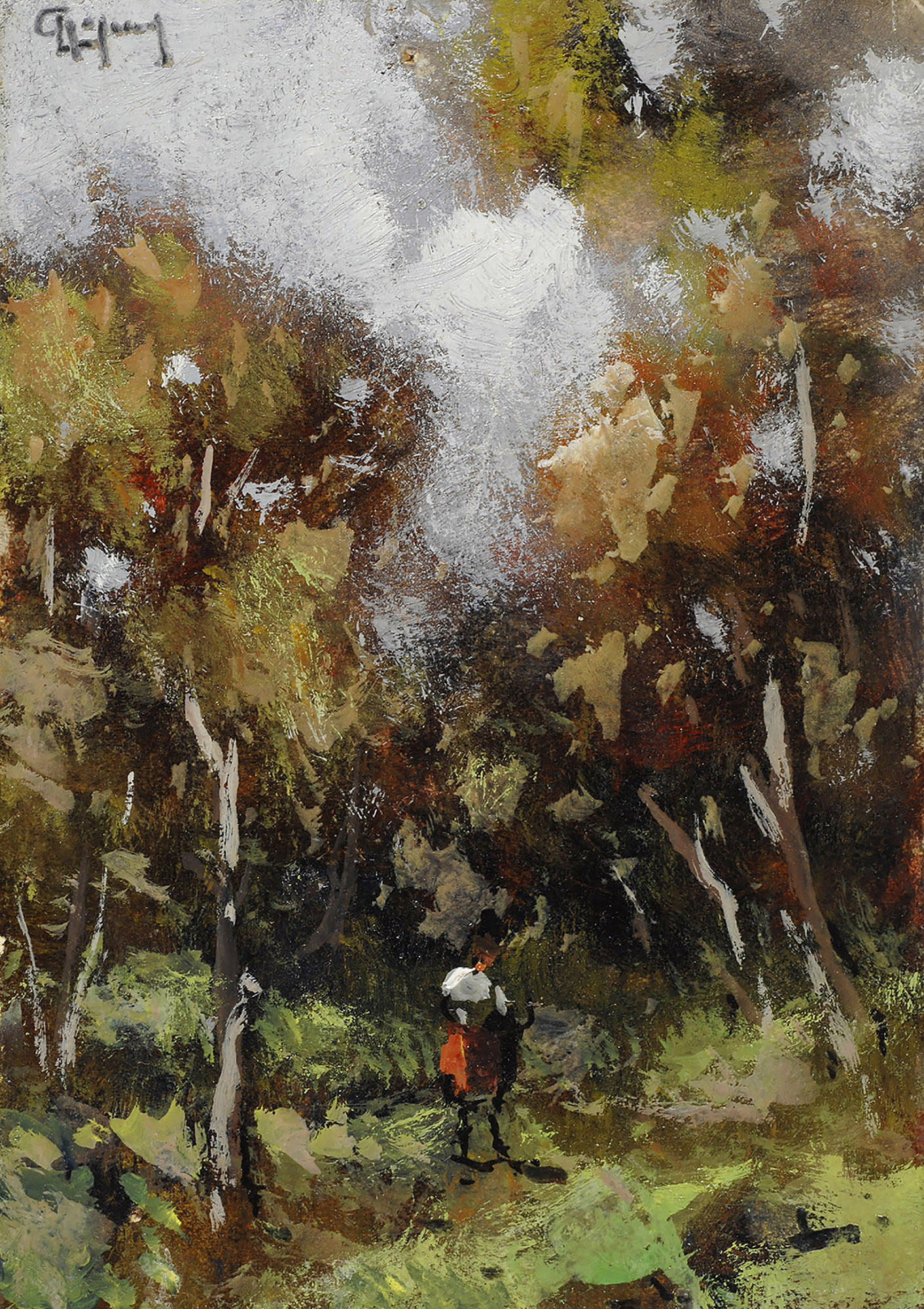 Lorenzo Gignous (1862-1958) Figura nel bosco Olio su cartone, cm. 15x10,5 Firma in alto sinistra.