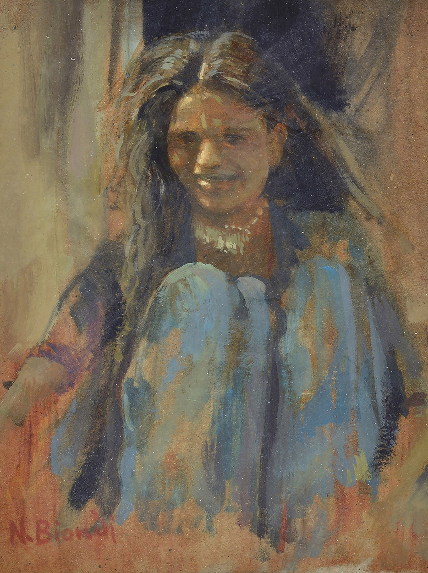 Nicola Biondi (1866-1929) Figura di donna Olio su cartone, cm. 16x12 Firma in basso a sinistra.