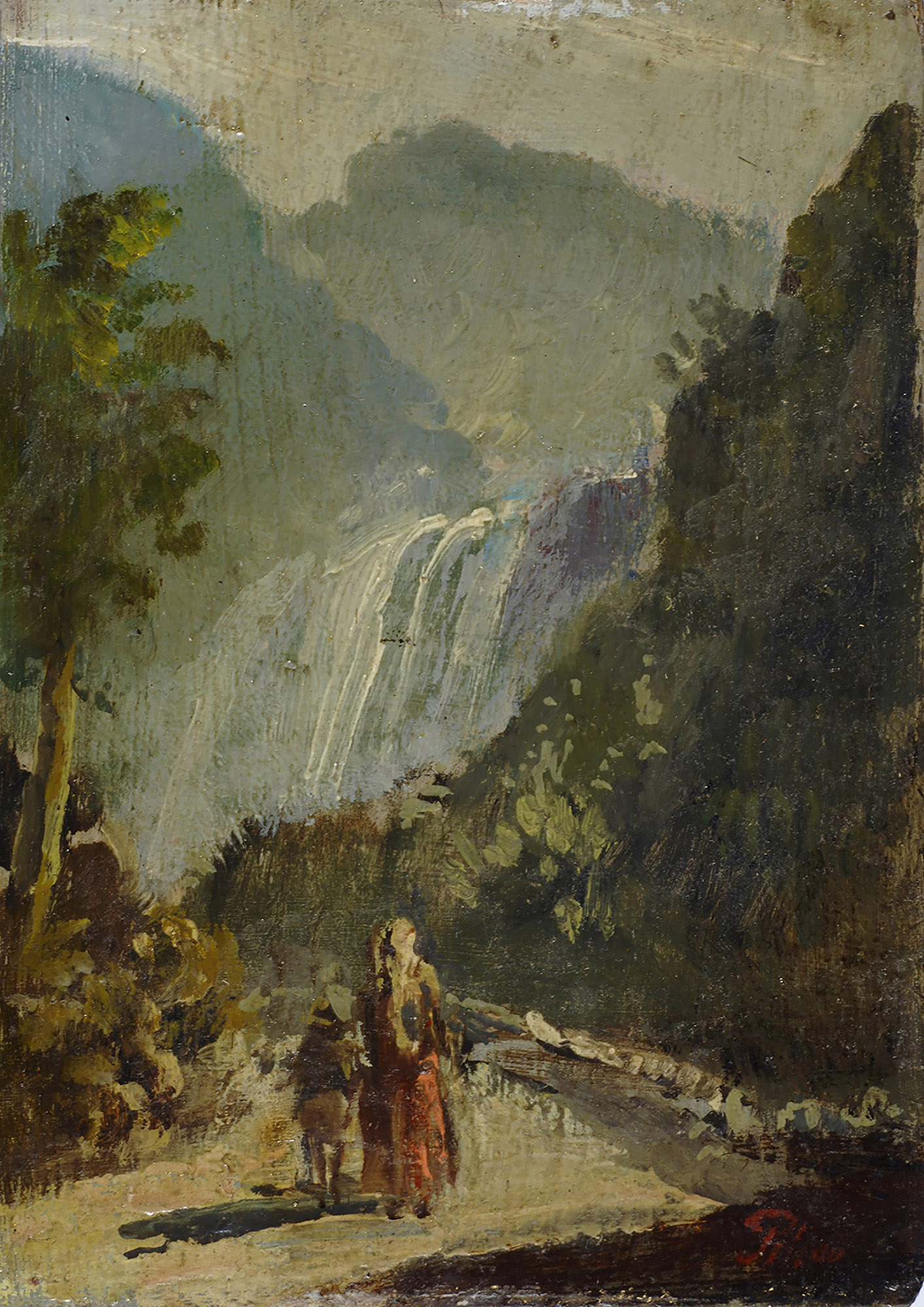 Antonio Sminck Pitloo (1791-1837) Paesaggio con cascata e figure Olio su tavola, cm. 15x10 Firma in basso a destra. Sul verso: etichetta Bottega Antiquaria Carlini Montecatini.