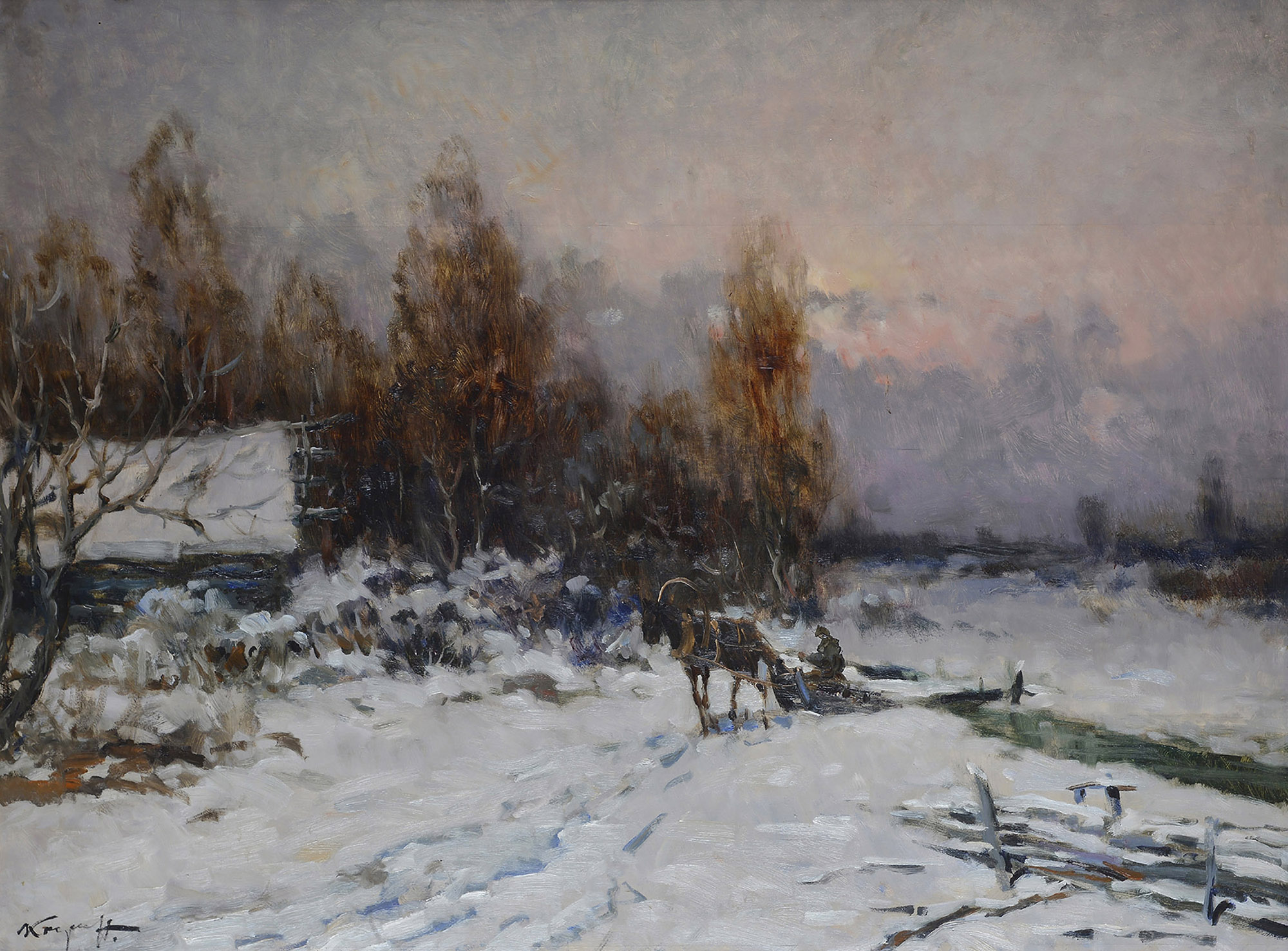 Ivan Karpoff (1898-1970) Nevicata Olio su tavola, cm. 89x119 Firma in basso a sinistra.