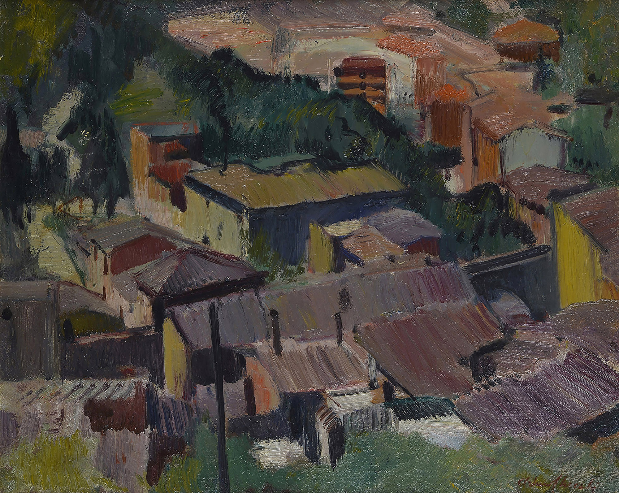 Arturo Checchi (1886-1971) Paesaggio con case Olio su tela, cm. 65x80 Firma in basso a destra. Sul verso: etichetta Raccolta Comm. Ezio Casamonti, Firenze.