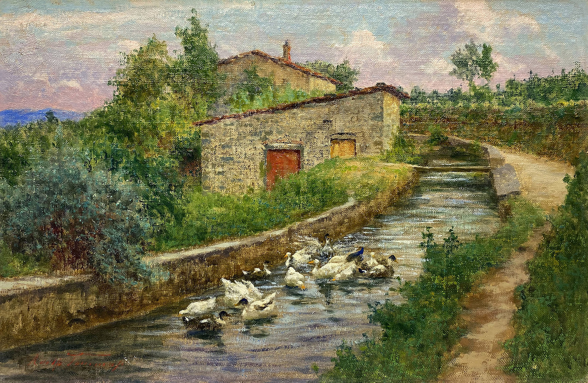 Adolfo Tommasi (1851-1933) Gorile con oche Olio su tela riportata su cartone, cm. 33x51 Firma in basso a sinistra. Sul verso: etichetta Galleria Ballerini, Prato.