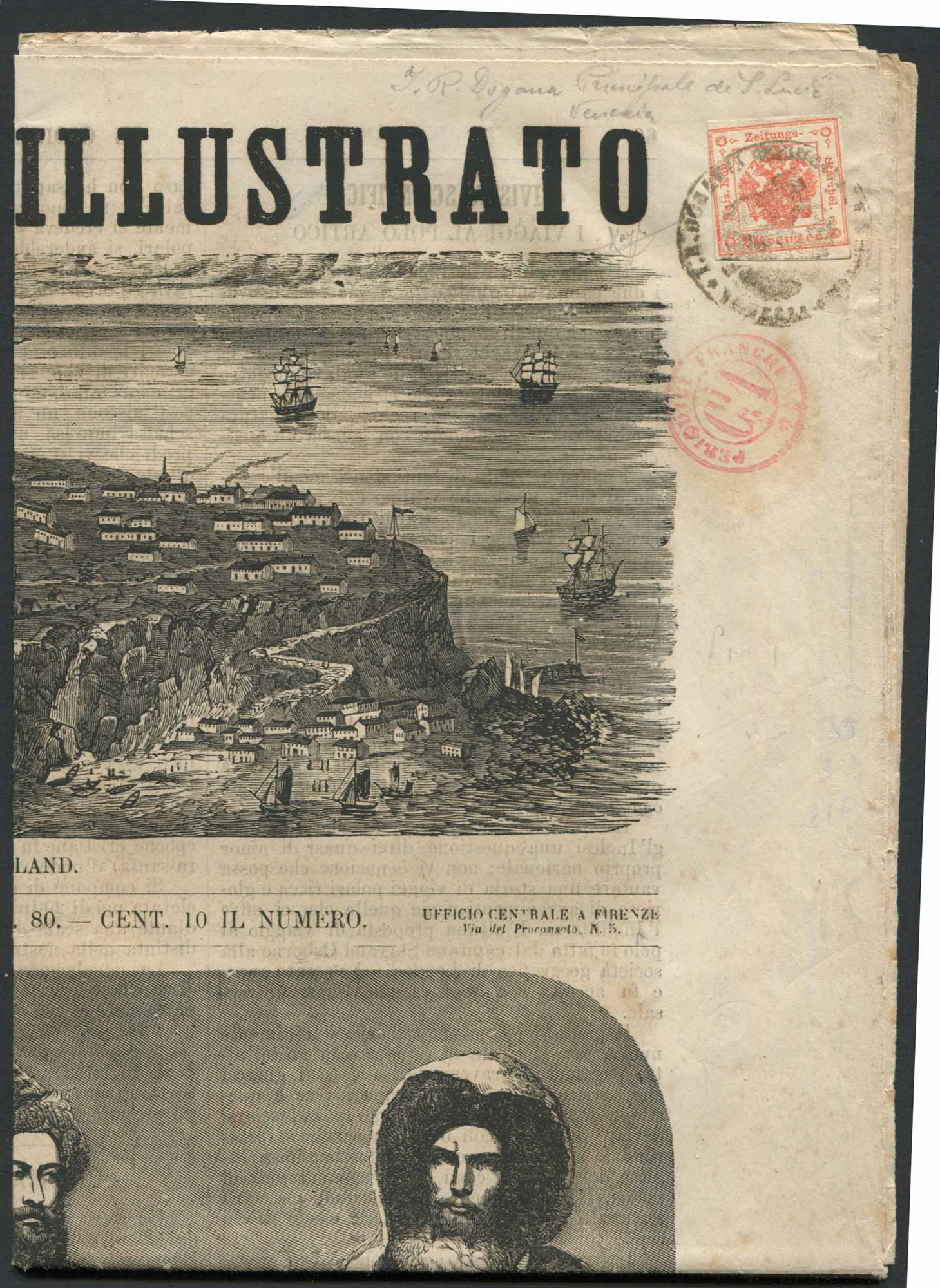 Lombardo Veneto. Giornale completo “Il Giornale Illustrato” del 10 marzo 1866., Affrancato con bollo d.c. in rosso “C.1-Periodici Franchi” e in arrivo tassato con segnatasse per giornali da 2 kr. vermiglio (S. 3) applicato a Santa Lucia in Venezia. Giornale e francobollo in eccellente stato. Raybaudi.