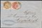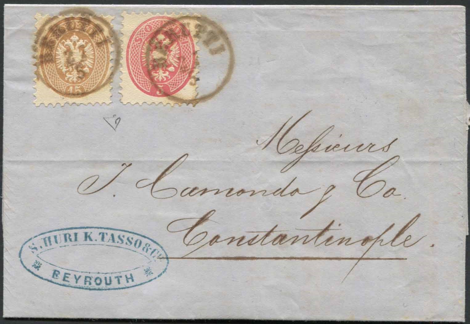 Levante austriaco. Lettere da Beirut per Costantinopoli del 27 maggio 1866,, Affrancata con 5 e 15 soldi dentellati 9.5, (S. 43,45), annullati col timbro in rosso brunastro “Berutti”. Bollo di arrivo al verso del 4 giugno. Bellissima, cert. E.D.