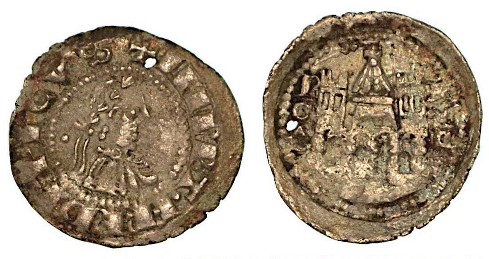 BERGAMO. Comune, a nome di Federico II (1194-1250)., Denaro scodellato, anni 1236-1260. Busto laureato a d. in cerchio perlinato; dietro, bisante. R/ Edificio centrale ad arco bilobo con tetto a quattro spioventi. All'interno del portale bisante. Al vertice, croce; ai lati, due torri merlate a due finestre. Alla base, quattro archi di mura su terreno roccioso. CNB. 37. MIR.,18. Mist. g. 0,67. B/MB