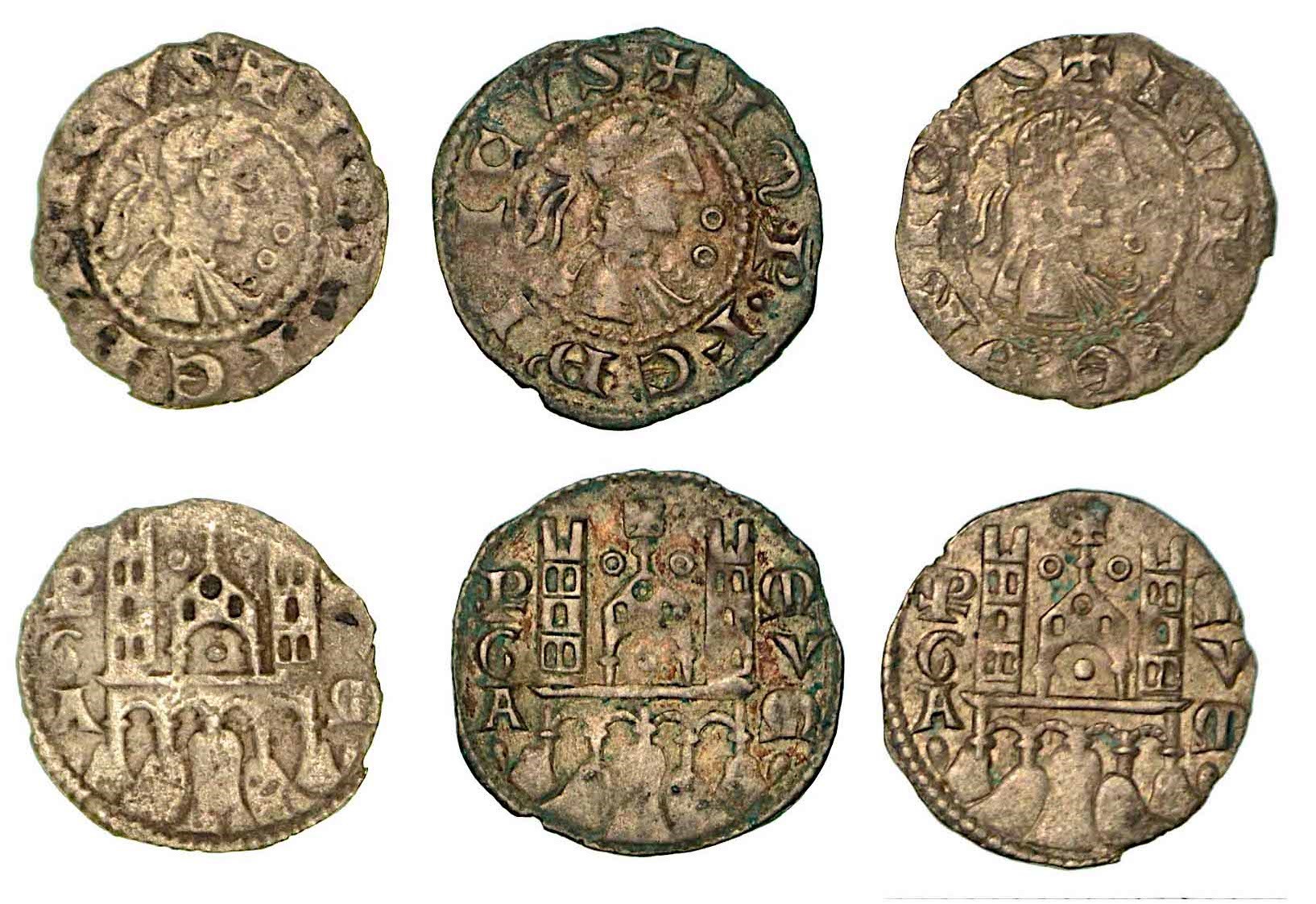 BERGAMO. Comune, a nome di Federico II (1194-1250)., Lotto di tre esemplari. Denaro planeto, anni 1282-1290. Busto laureato a d. in cerchio perlinato; a lato, due anelli in pila. R/ Edificio centrale ad un arco con tetto a capanna. All'interno dell'arco, bisante. Al vertice, sfera e croce affiancata da due anelli. Ai lati, due torri merlate a cinque finestre. Alla base, quattro archi di mura su terreno roccioso. CNB. 94. MIR.,18. Mist. g. 0,81 - 0,66 - 0,90. B/MB