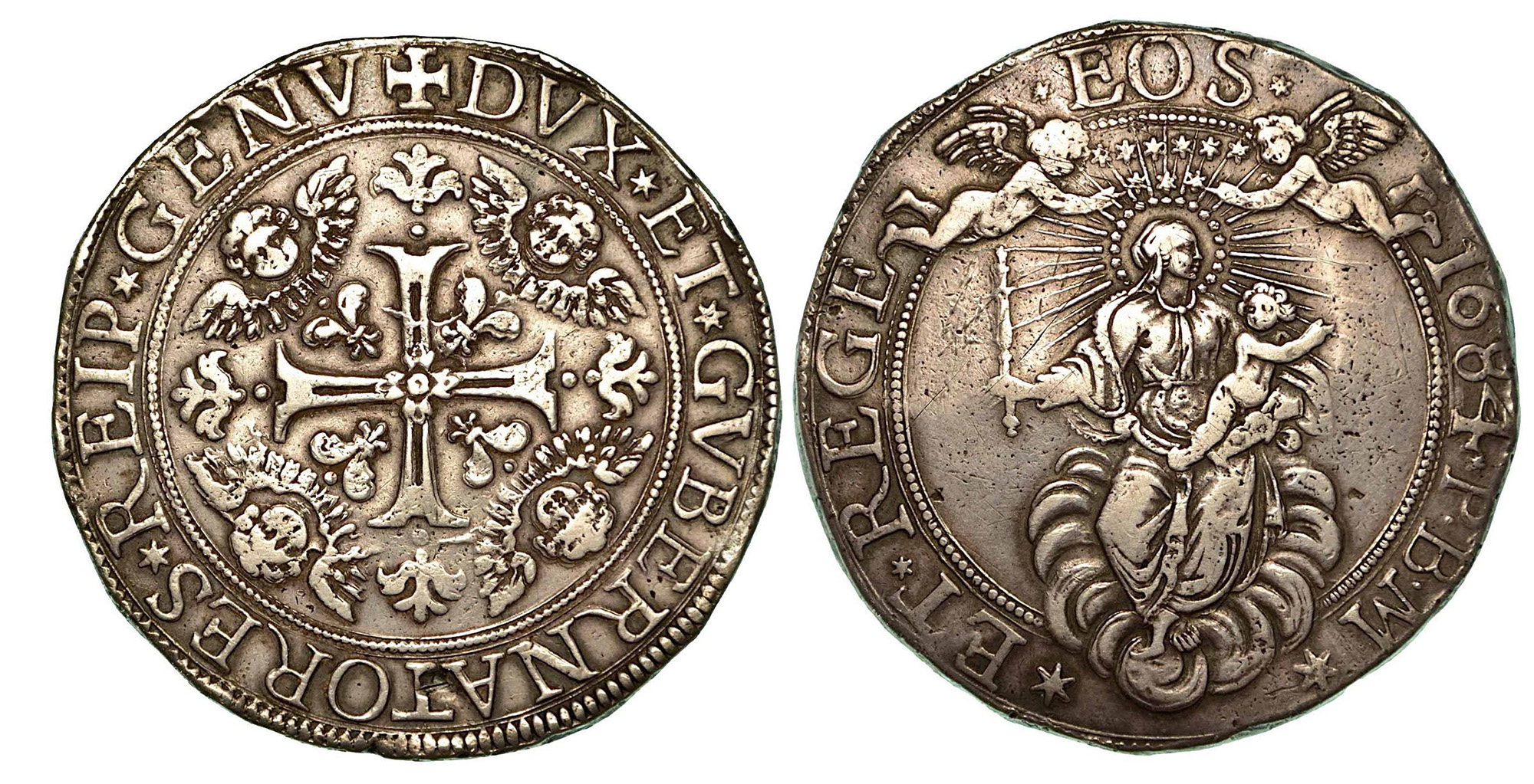 GENOVA. Dogi biennali, 1528-1797., Da 2 scudi 1684. Croce patente ornata e accantonata da teste di cherubino ad ali spiegate. R/ La Beata Vergine con il Bambino in braccio seduta sulle nubi tiene nella mano d. uno scettro; in alto, due angeli reggono una corona di stelle. CNI 4 var. MIR 290/20. Ricci, Note di Numismatica voll. 8-9, 1992, p. 8 (questo esemplare illustrato). Arg. g. 76,20. BB