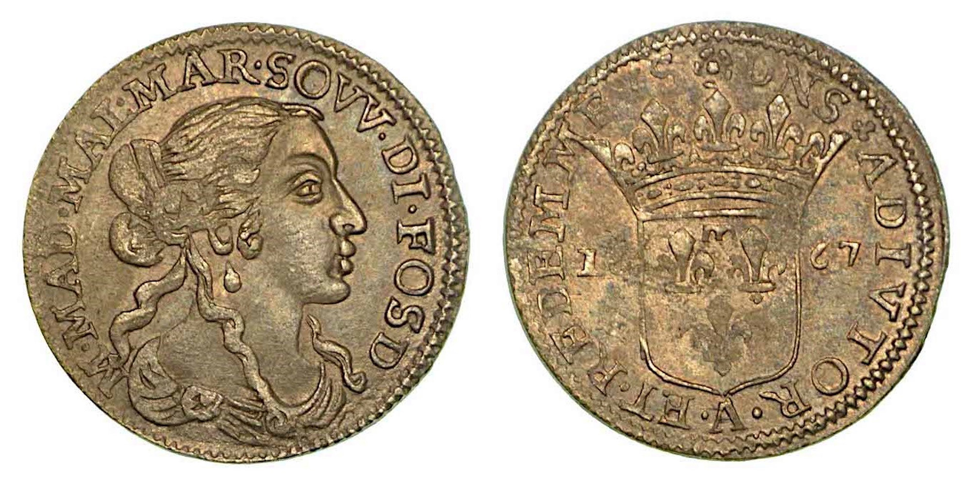 FOSDINOVO. Maria Maddalena Centurioni Malaspina, 1663-1669., Luigino 1667. Busto muliebre a d. R/ Stemma coronato; ai lati, 16 - 67 e, sotto, nel giro, A. Cammarano 71. MIR 46. Arg. g. 2,06. q.SPL