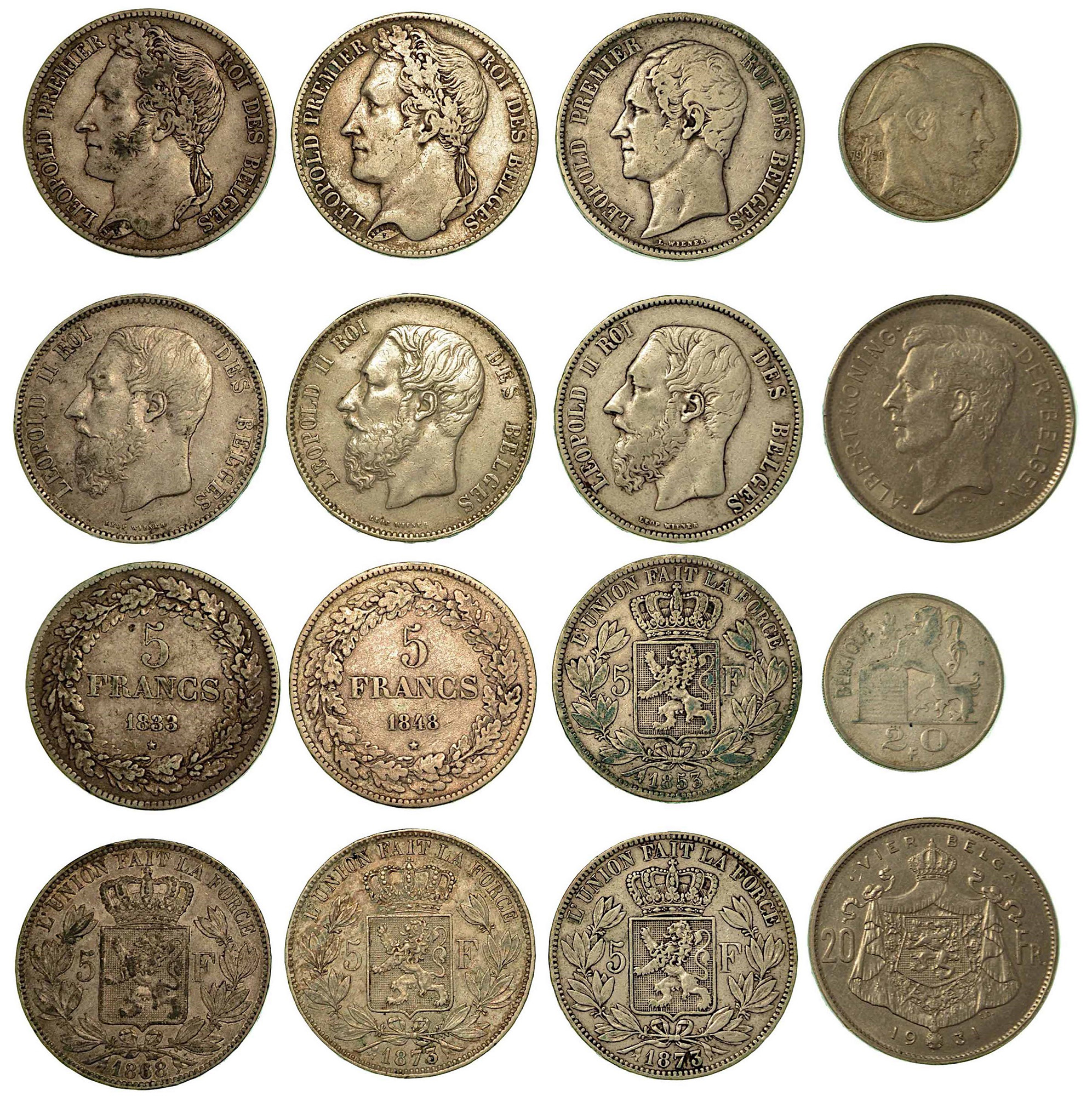 BELGIO. Lotto di otto monete., 20 Francs 1931 (Nichel-BB). 5 Francs 1833 (MB) - 1848 (MB) -1853 (MB) - 1868 (q.BB) - 1873 (x 2 esemplari) (MB/BB; q.BB). 20 Francs 1950 (MB) KM# 102-3.1-3.2-17-24.