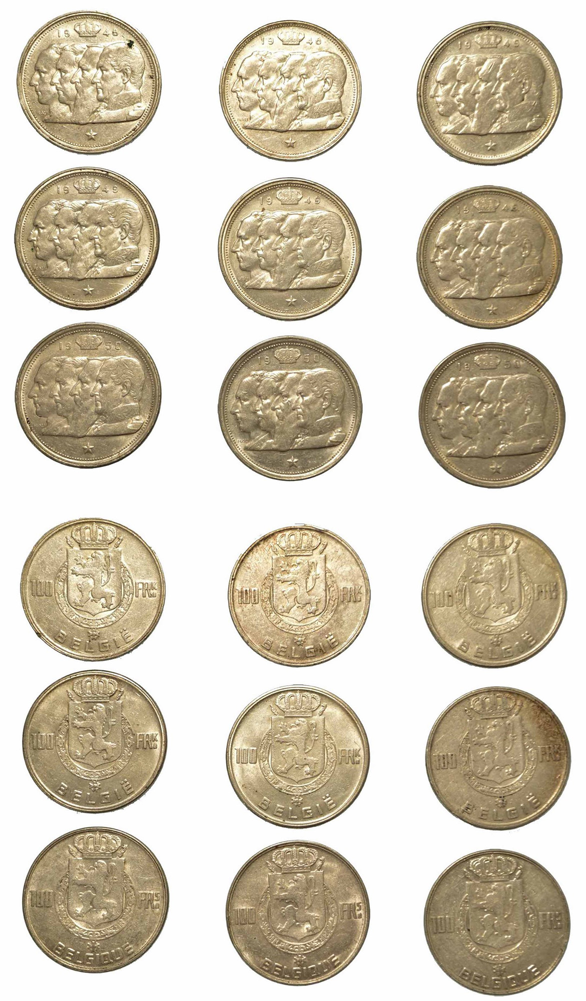 BELGIO. Lotto di 18 monete., Reggenza del Principe Charles, 1944-1950. 100 Francs 1948 (x 2 tipo Belgie e asse a moneta); 1949 (x 4 tipo Belgie e asse a moneta); 1950 (x 6 tipo Belgique e asse a moneta); 1951 (x 5 tipo Belgie e asse a moneta); 1954 (tipo Belgique e asse a moneta). KM# 138.1 - 139.1. Conservazioni da BB a SPL.