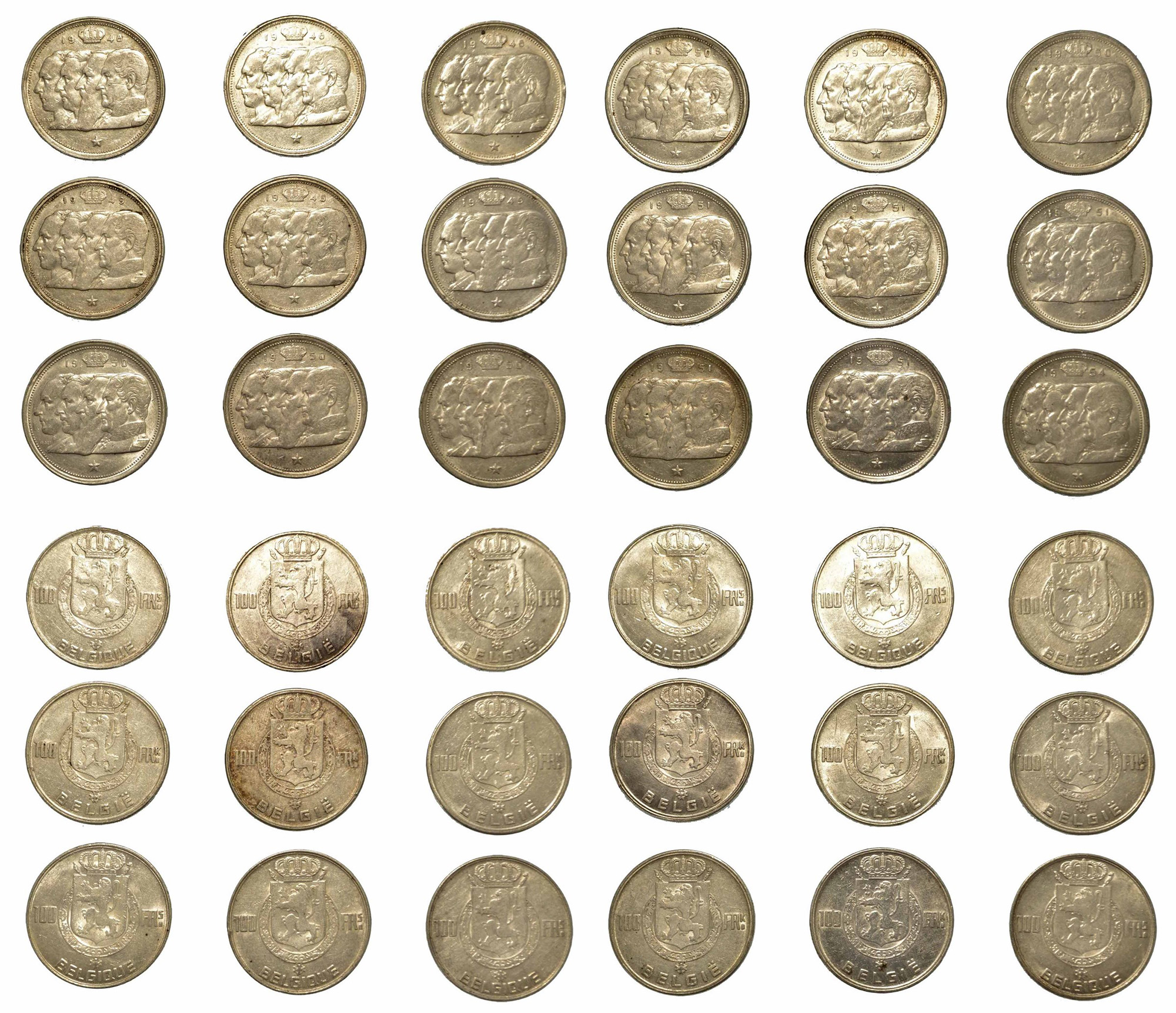 BELGIO. Lotto di 18 monete., Reggenza del Principe Charles, 1944-1950. 100 Francs 1948 (x 1 tipo Belgique e asse a moneta; x 2 tipo Belgie e asse a moneta); 1949 (x 3 tipo Belgie e asse a moneta); 1950 (x 6 tipo Belgique e asse a moneta); 1951 (x 5 tipo Belgie e asse a moneta); 1954 (tipo Belgique e asse a moneta). KM# 138.1 - 139.1. Conservazioni da BB a SPL.