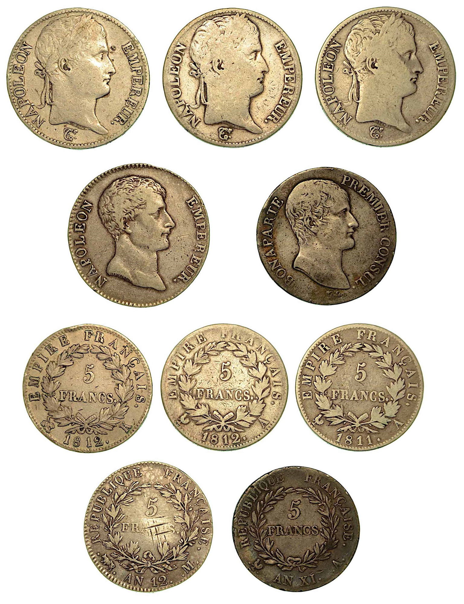 FRANCIA. Lotto di cinque monete., Napoleon Bonaparte, 1801-1815. 5 Francs AN XI A (MB) - AN 12 M (MB-graffi al rovescio) - 1811 A (MB) - 1812 A (MB) - 1812 K (MB-colpo). KM# 650.1 - 659.10 - 694.1(2).