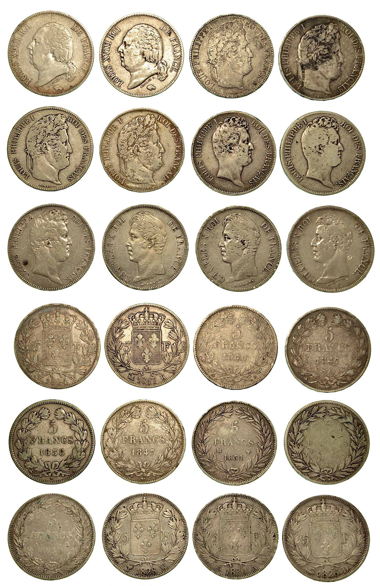FRANCIA. Lotto di dodici monete., Louis XVIII - Charles X - Louis Philippe, 1830-1848. 5 Francs. Conservazioni da B/MB a BB.