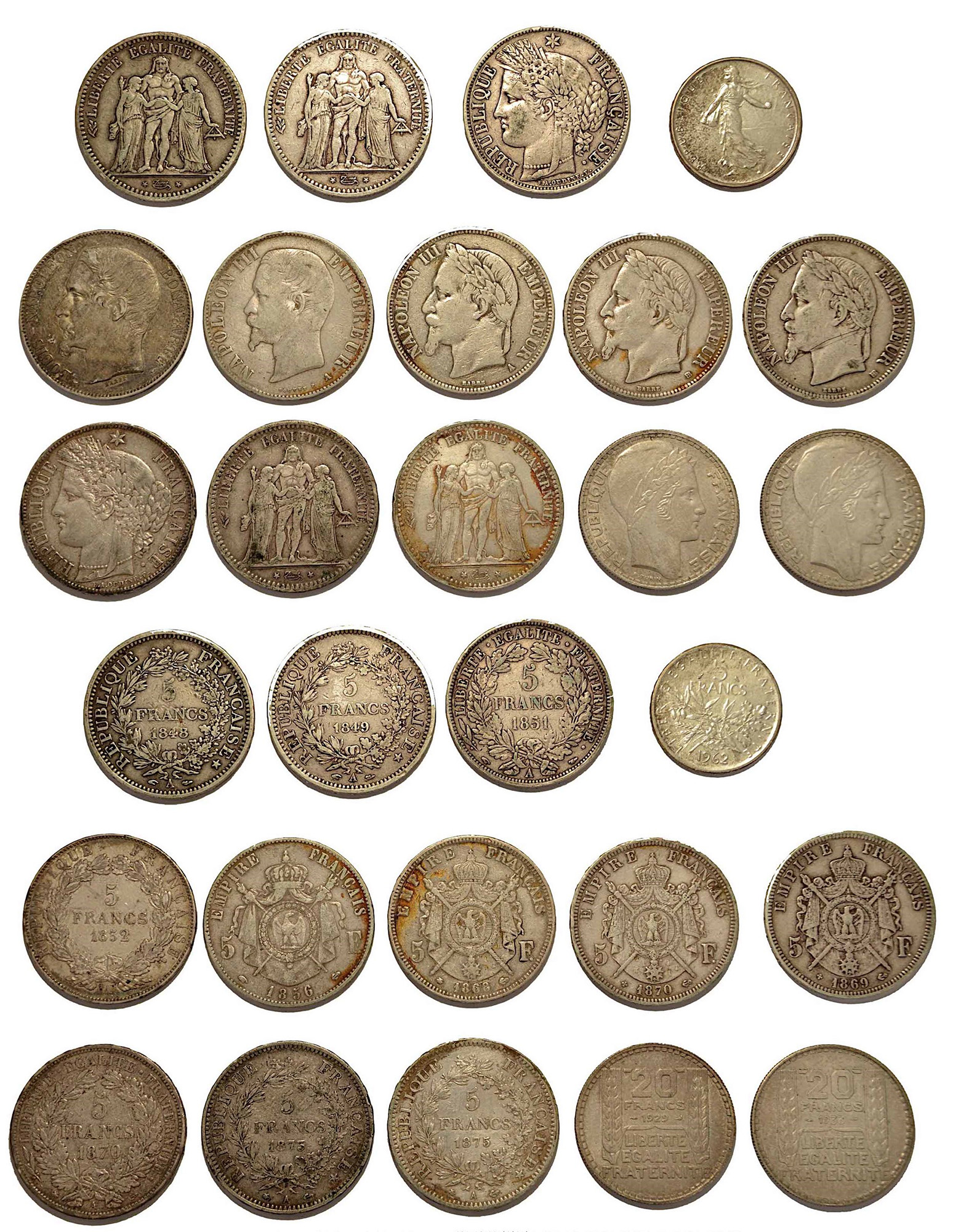 FRANCIA. Lotto di quattordici monete., Deuxieme Republique - Napoleon III - Troisieme/Cinquieme Republique. 5 Francs. Conservazioni da MB a q.SPL.