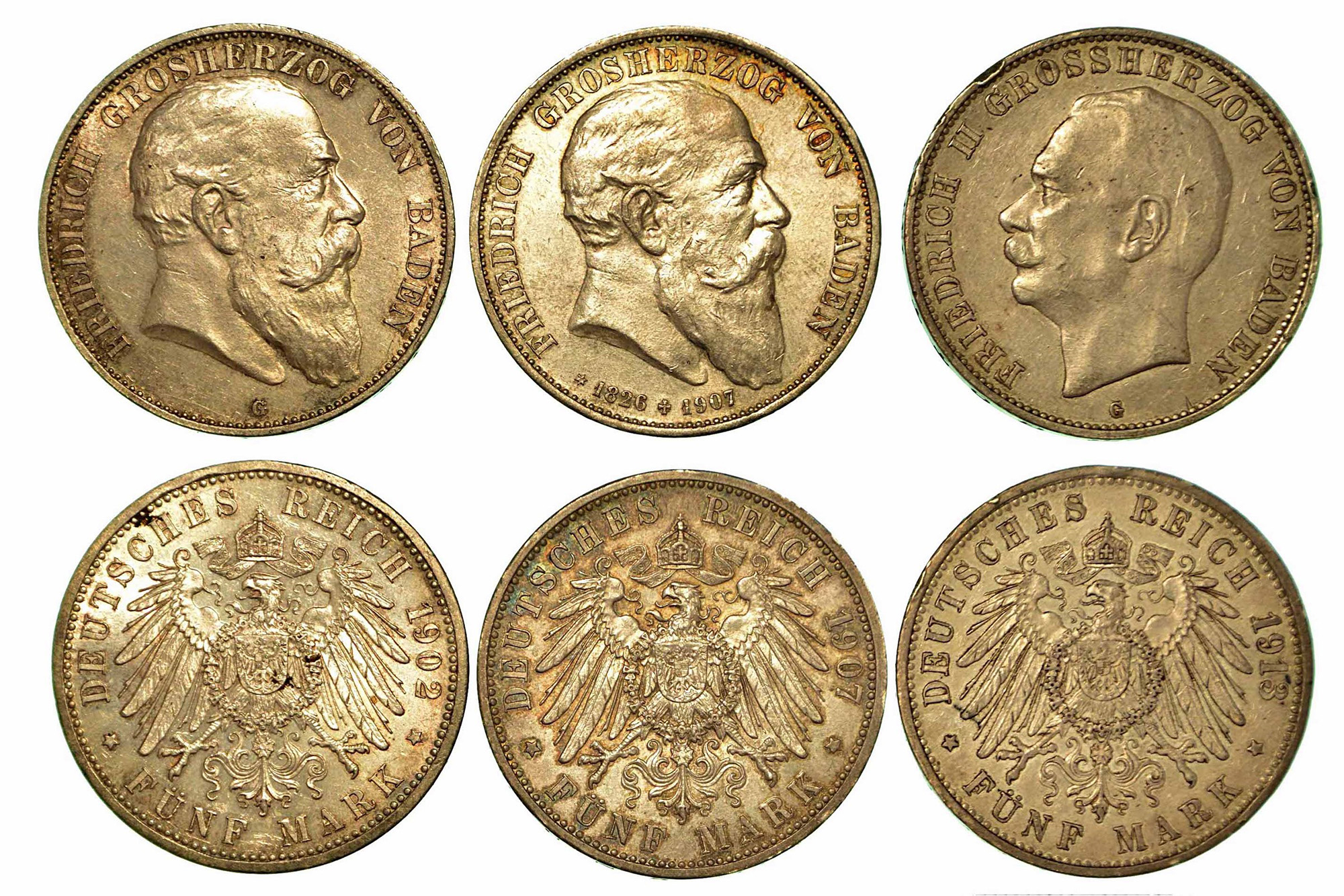 GERMANIA-BADEN. Lotto di tre monete., 5 Mark 1902 (SPL/q.FDC) - 1907 (q.SPL) - 1913 (BB/SPL-colpi).