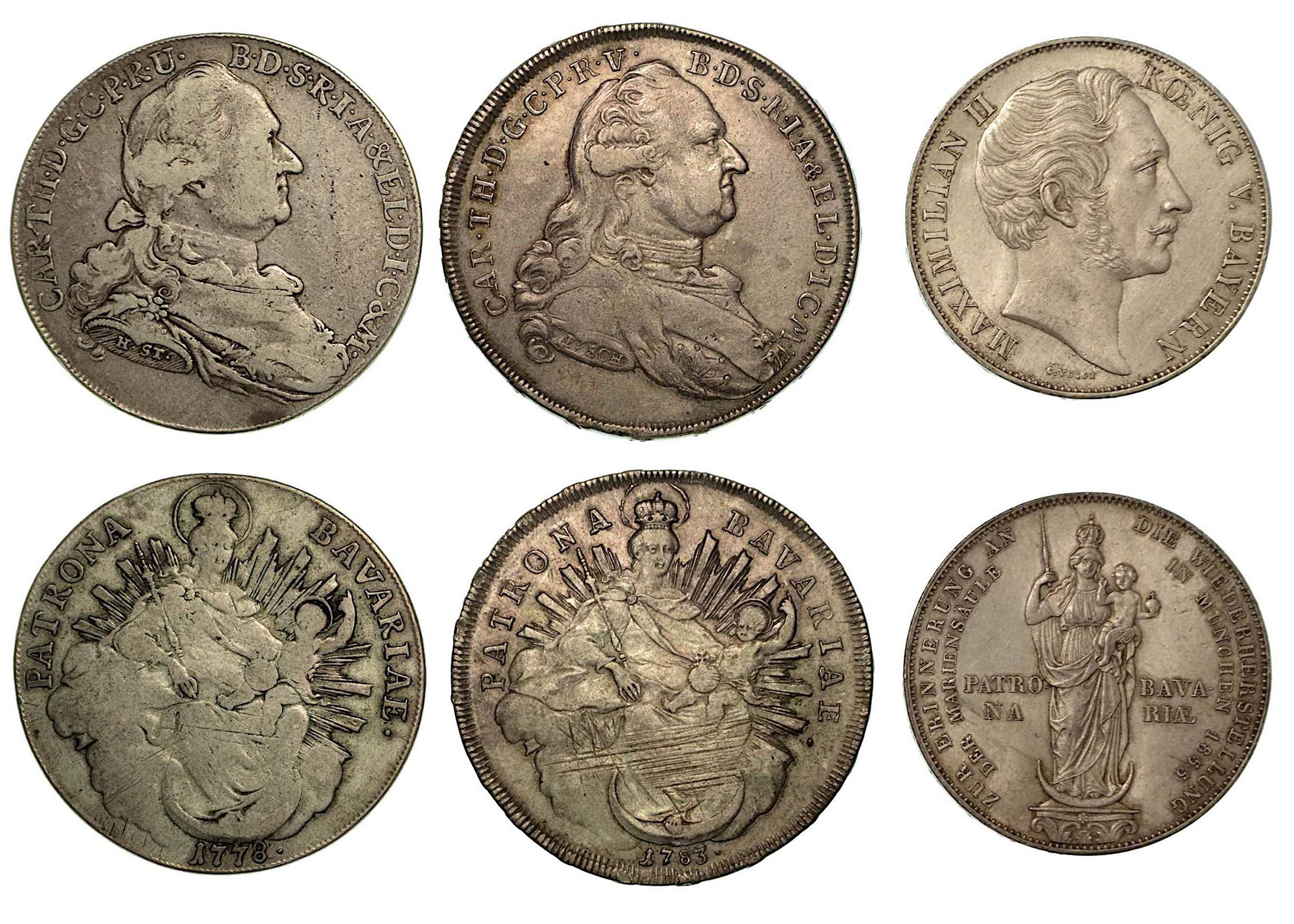 GERMANIA - BAVIERA. Lotto di tre monete., Maximilian II - Karl Theodor. Thaler 1778 (B/MB) - 1783 (BB-Graffi di conio al rovescio). 2 Gulden 1855 (q.SPL). KM# 519.2. - 562 - 563.1 - 848.