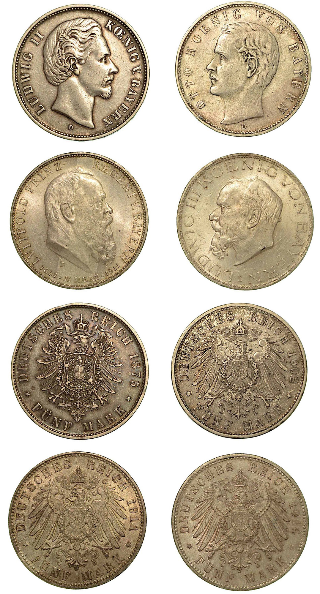 GERMANIA - BAVIERA. Lotto di quattro monete., 5 Mark 1875 (BB-con cartellino Santamaria) - 1902 (BB/q.SPL-macchie) - 1911 (SPL-macchie) - 1914 (SPL). KM# 875 - 915 - 999 - 1007.