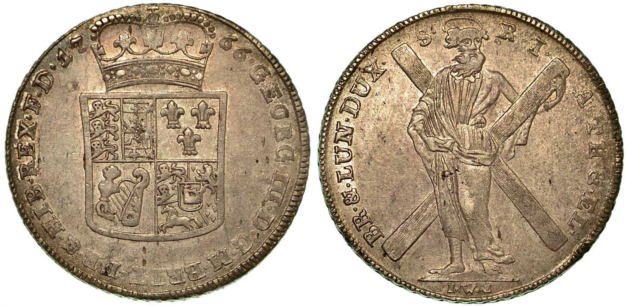 GERMANIA - BRAUNSCHWEIG - LÜNEBURG - CALENBERG - HANNOVER. Georg III, 1760-1820., Thaler 1766. Stemma coronato. R/ S. Andrea. DAV. 2104. Arg. g. 29,04. q.SPL
