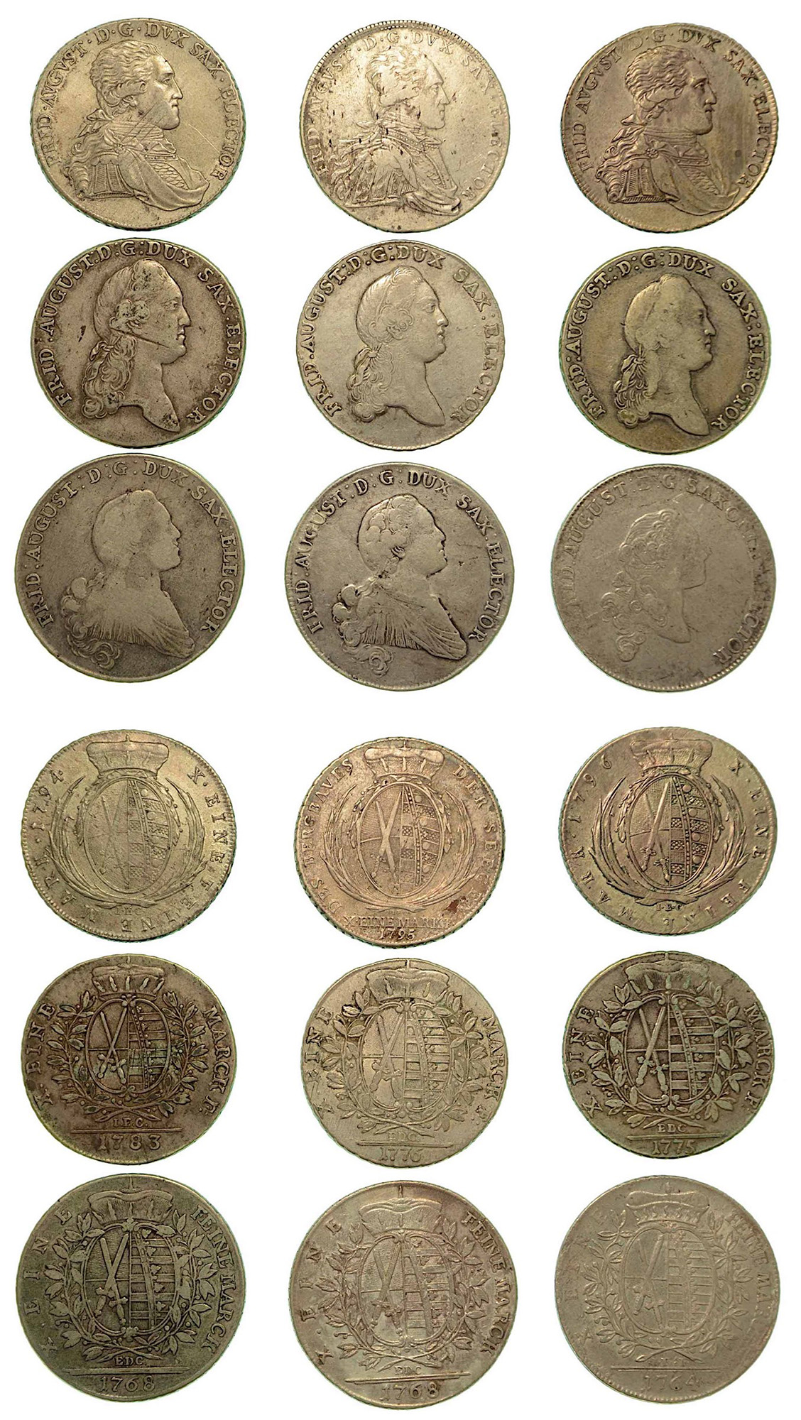 GERMANIA - SAXONY ALBERTINE. Lotto di nove monete., Friedrich Augustus III, 1763-1806. Thaler 1764 (MB/BB) - 1768 x 2 esemplari (B/MB; MB/BB) - 1775 (MB) - 1776 (q.BB) - 1783 (MB/BB-graffio al diritto) - 1794 (q.BB-graffi di conio al diritto) - 1795 (q.BB) - 1796 (BB). KM# 977.1 - 983 - 990 - 992.2 - 1027.2 - 1036.