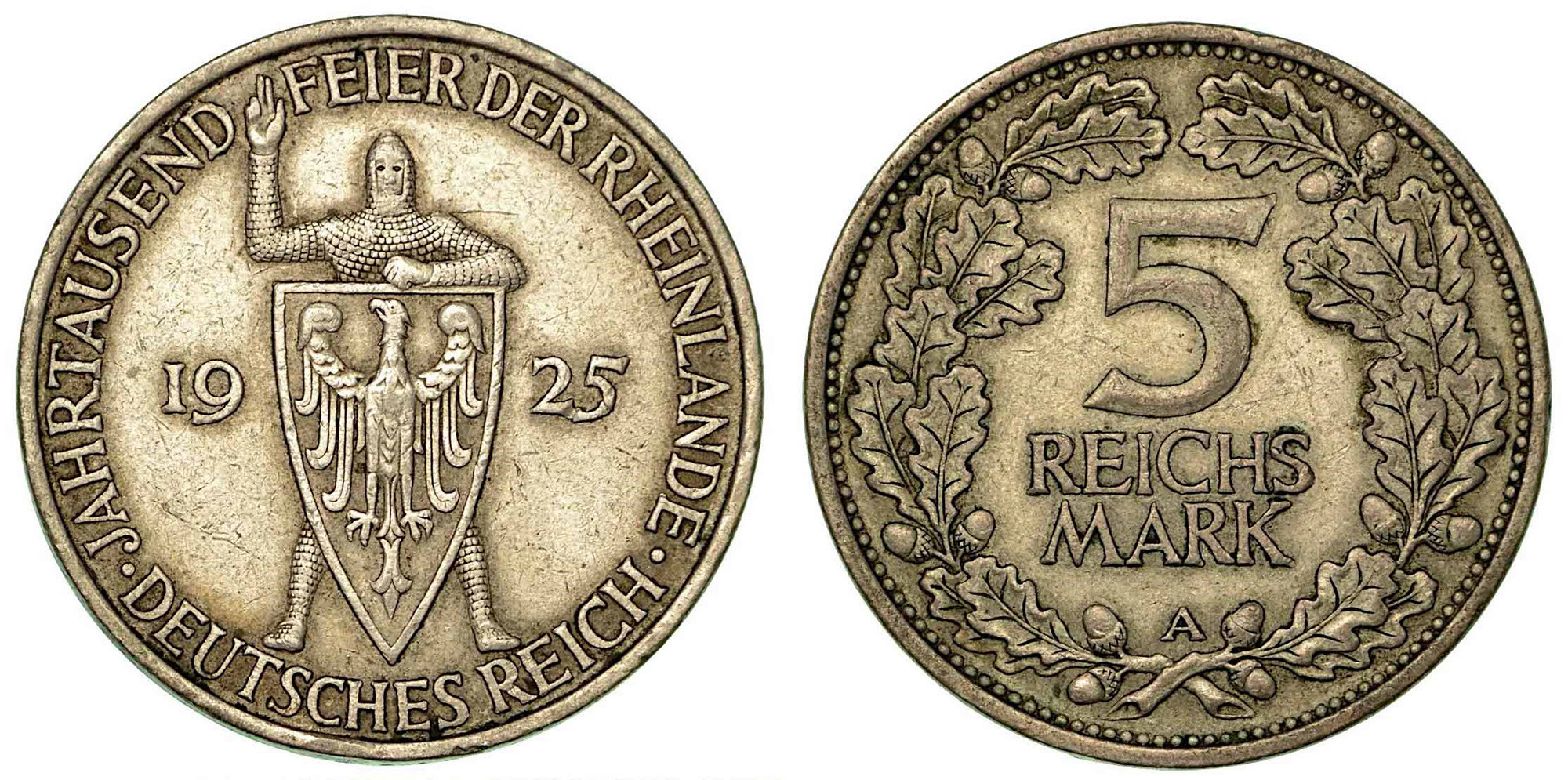 GERMANIA - REPUBBLICA DI WEIMAR, 1919-1933., 5 Reichsmark 1925 (Millenario Renania).