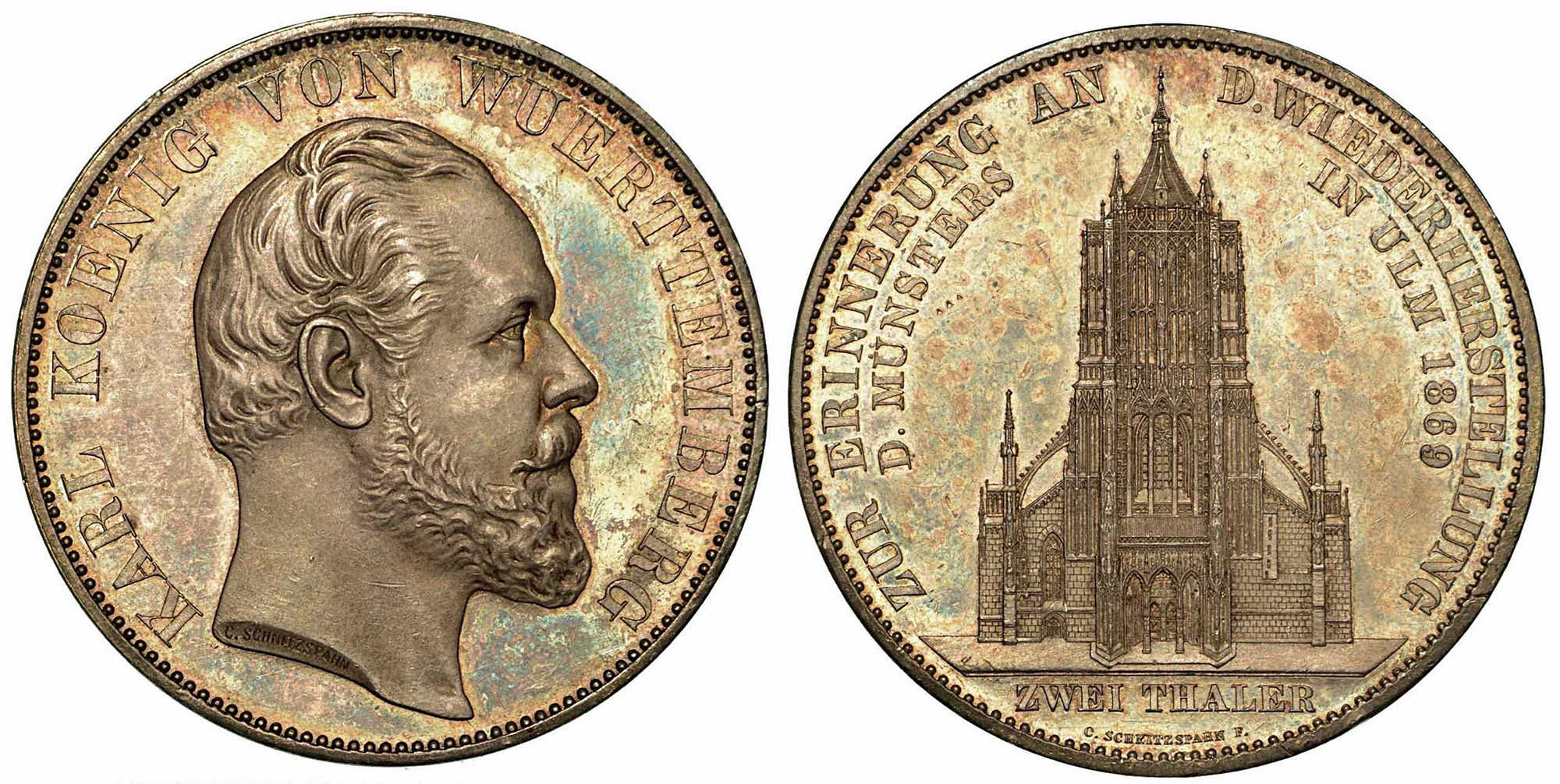 GERMANIA - WURTTEMBERG. Wilhelm II, 1891-1918., 2 Thaler 1869, zecca di Berlino. Testa a d. R/ Cattedrale di Ulm. KM# 618. Arg. g. 37,11. SPL