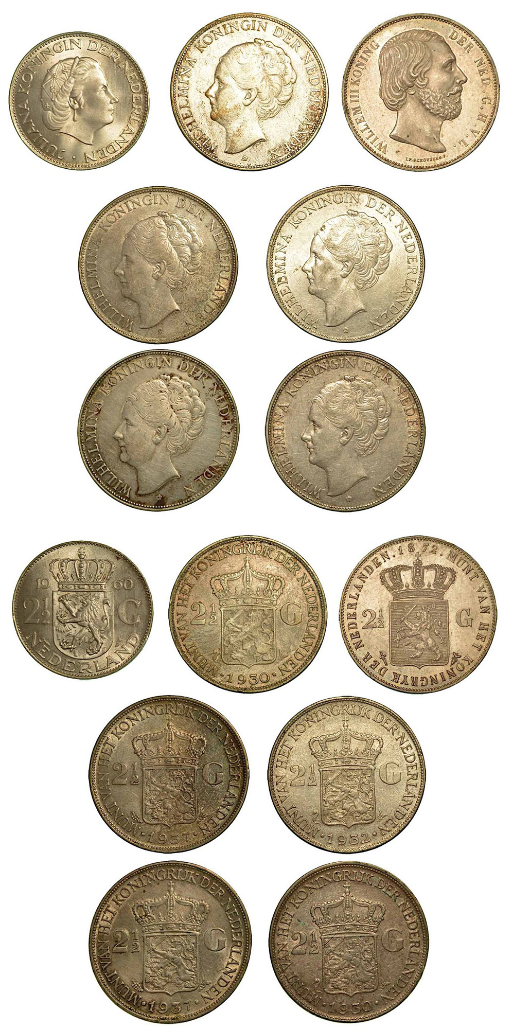 PAESI BASSI. Lotto di sette monete., 2 1/2 Gulden 1872 (q.SPL) - 1930 (q.BB) - 1930 (BB(q.SPL) - 1932 (q.SPL-impercettibili graffi) - 1937 x 2 esemplari (BB/q.SPL; BB/q.SPL) - 1960 (SPL/q.FDC). KM# 82-165-185.