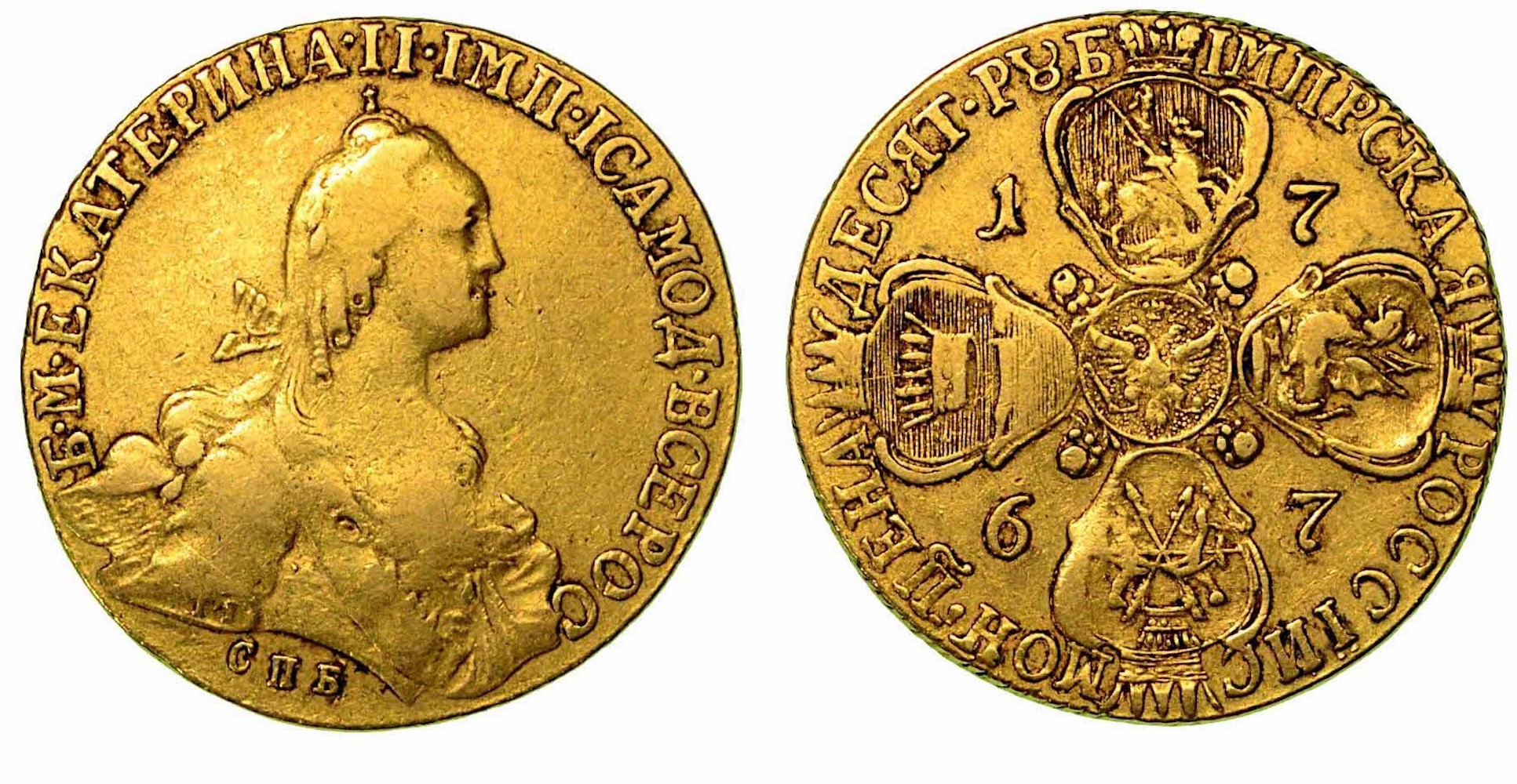 RUSSIA. Katerina II, 1762-1796., 10 Rubli 1767, zecca di San Pietroburgo.