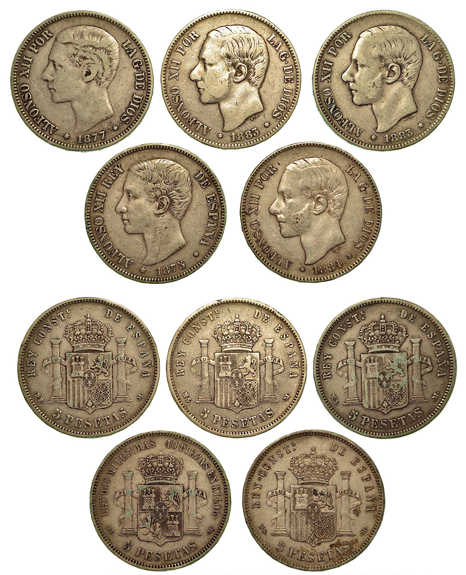 SPAGNA. Lotto di cinque monete., Alonso XII, 1874-1885. 5 Pesetas. Conservazioni da MB/BB a BB.