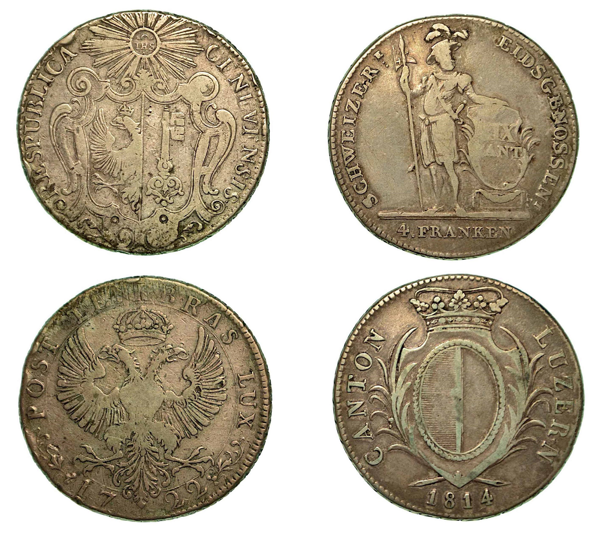 Svizzera. Lotto di due monete., Ginevra, Tallero 1722 (MB-colpi). Lucerna, 4 Franken 1814 (B/MB). BM# 69 - 109.