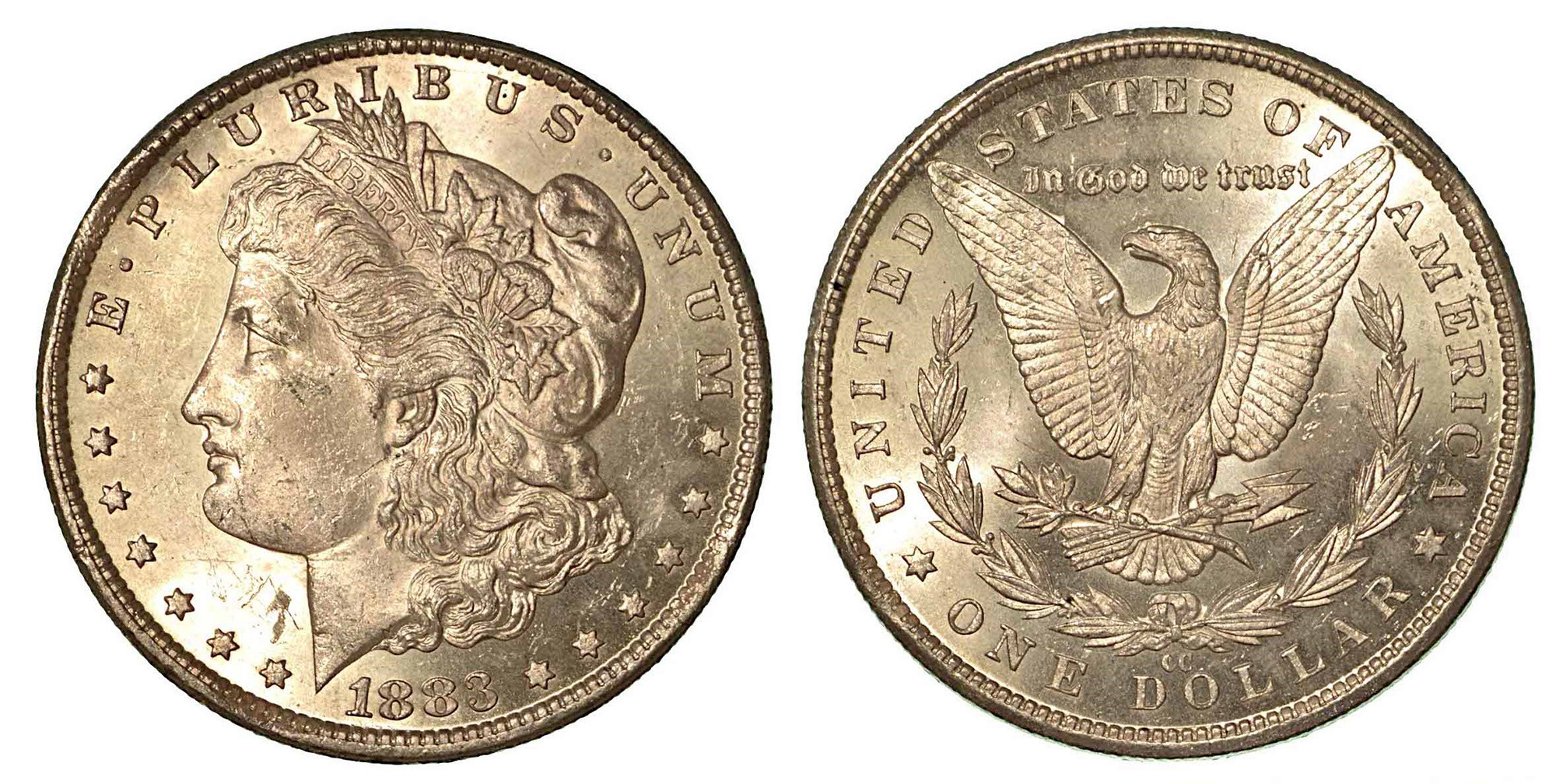 USA. Morgan Dollar 1883, zecca di Carson City., Testa della Libertà a s. R/ Aquila ad ali spiegate, volta a s., stringe fra gli artigli ramo d'ulivo e frecce entro corona di alloro. KM# 110. Arg. g. 26,72. SPL/q.FDC