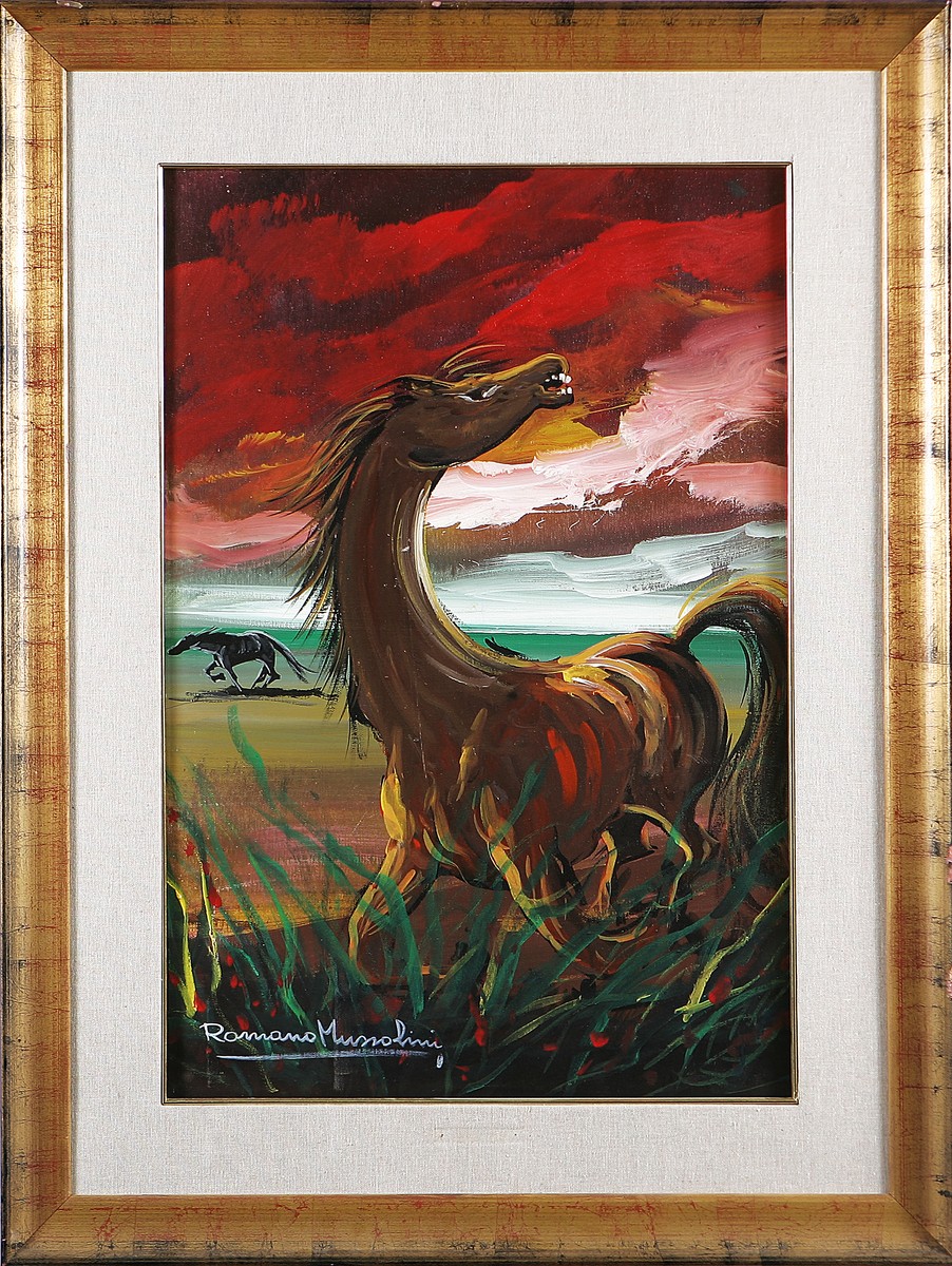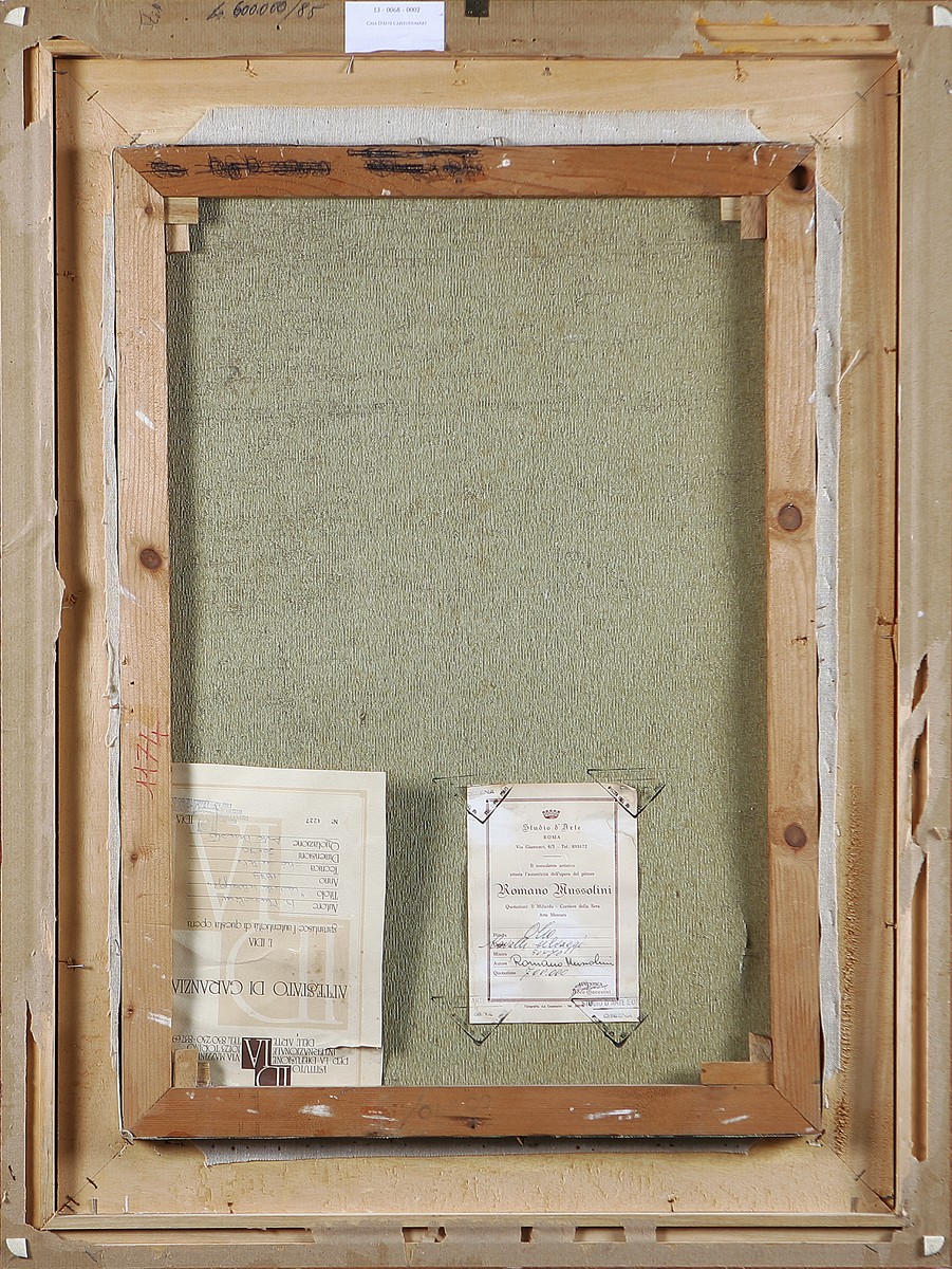 MUSSOLINI ROMANO (1927 - 2008) Senza titolo. Olio su tela . Cm 50,00 x 70,00. Firma in basso a sinistra. Al retro timbri dello Studio d'Arte Europa, Cesena. Cornice presente