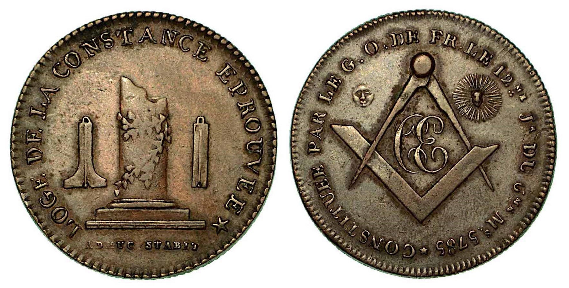 FRANCIA. Oriens de Paris. Loggia della Constance Eprouvee, 5785 (prima del 1812)., Medaglia in bronzo. Colonna tronca ornata da edera e affiancata da una livella e una perpendicolare. R/ Squadra e compasso incrociati attorno alle iniziali C. E.; ai lati in alto, la Luna e il Sole. diam. mm. 28,5. g. 9,63. BB