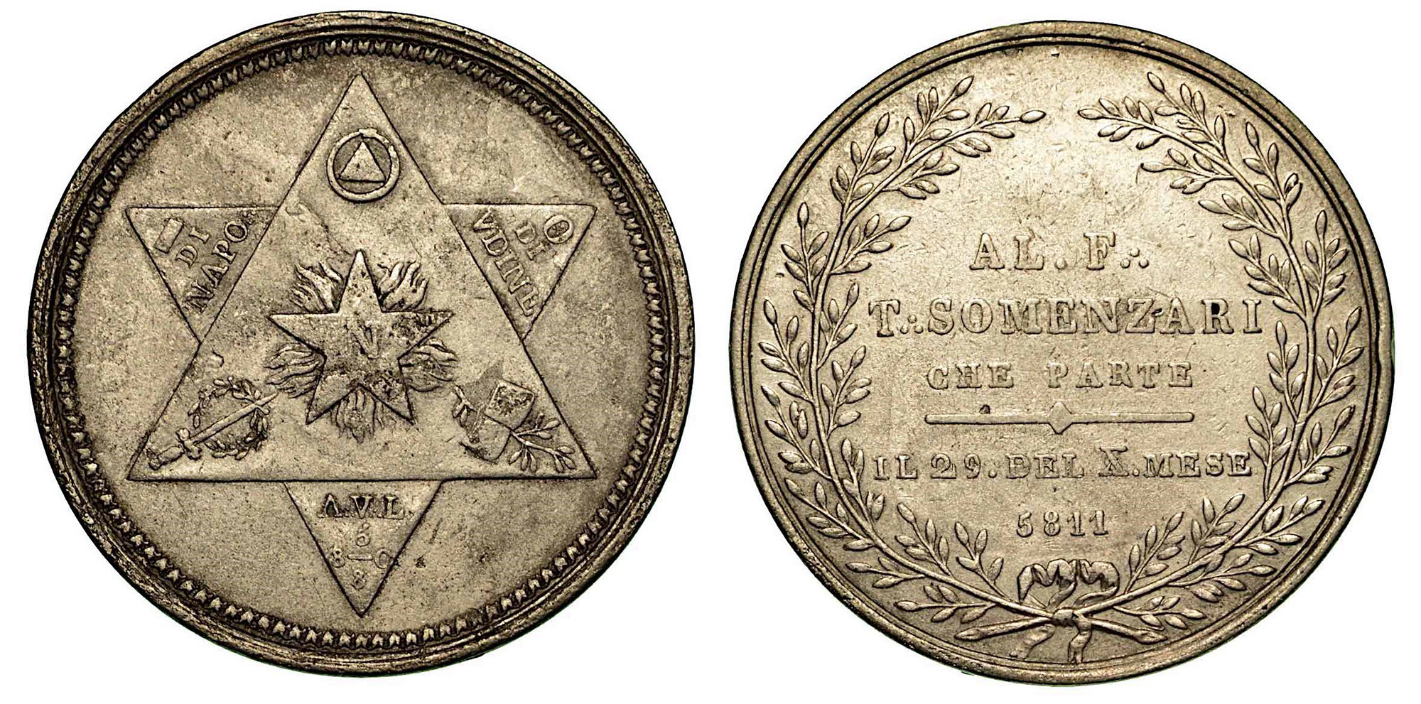 ITALIA. Loggia Napoleone Oriente., Medaglia in metallo bianco (fusione)1811. Saluto a Teodoro Somenzari. Due triangoli sovrapposti con al centro una stella fiammeggiante e al centro la lettera N; ai vertici degli angoli simboli massonici. R/ Legenda e data in cinque righe fra due rami di alloro. diam. mm. 37,4. g. 19,55. BB