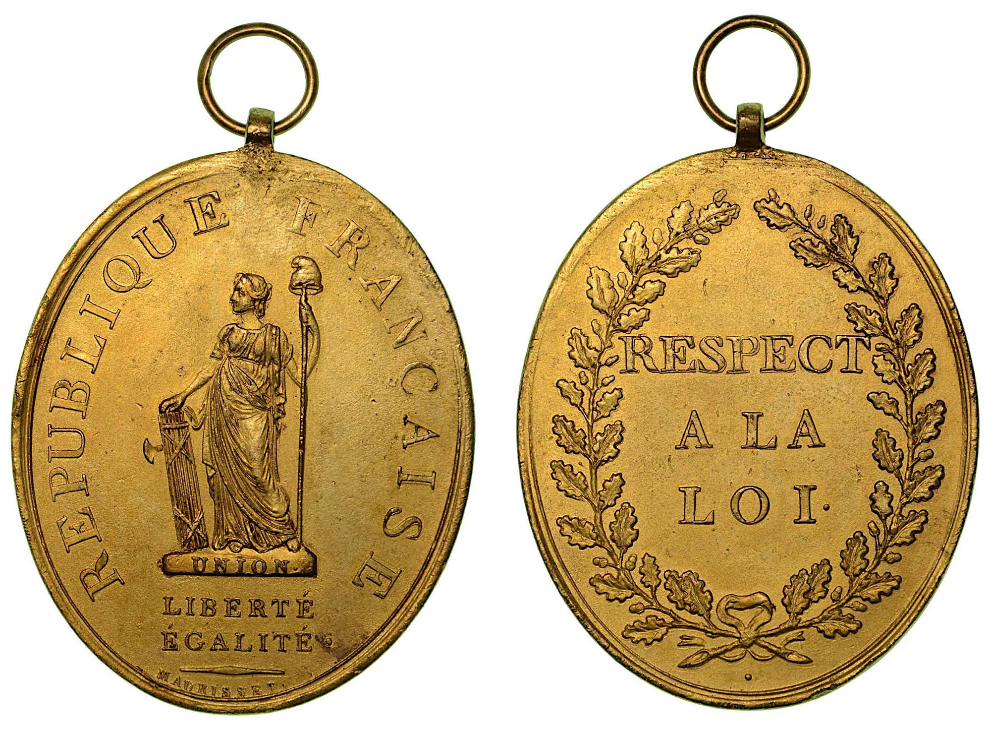 AMMINISTRATORI PROCURATORI DELLA REPUBBLICA., Medaglia ovale in bronzo dorato con anello d'epoca. La Repubblica francese in piedi su piedistallo tiene fascio e simbolo della libertà. R/ Scritta RESPECT / A LA / LOI in tre righe entro corona di quercia. Opus di T. Maurisset. Essling, 664. Julius, 385. Misure. mm. 43,1 x 56,2. q.SPL