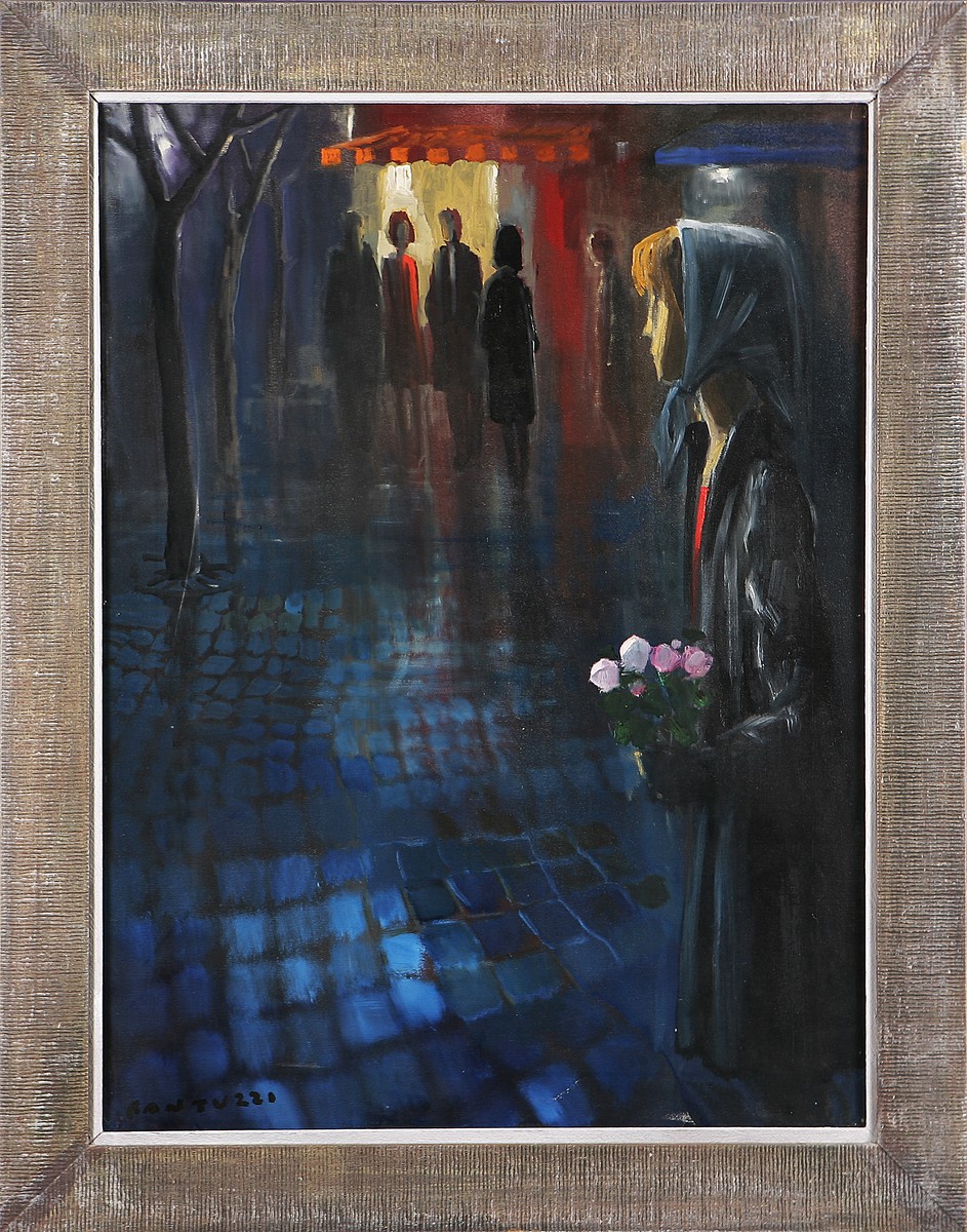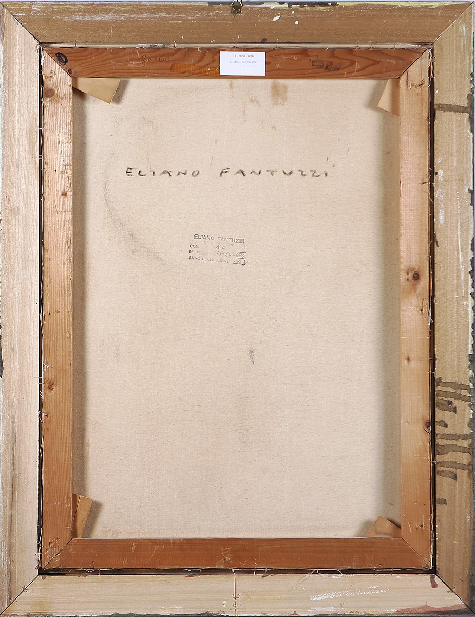 FANTUZZI ELIANO (1909 - 1987) Senza titolo. 1968. Olio su tela . Cm 60,00 x 80,00. Firma in basso a destra. Firma e timbro dell'artista al retro con l'anno di esecuzione. Opera archiviata presso l'Archivio Generale Eliano Fantuzzi, Corchiano (VT) a cura di Vincenzo Balsamo, come da documentazione fotografica, allegata all'opera, riportante il relativo numero d'inventario . Cornice presente