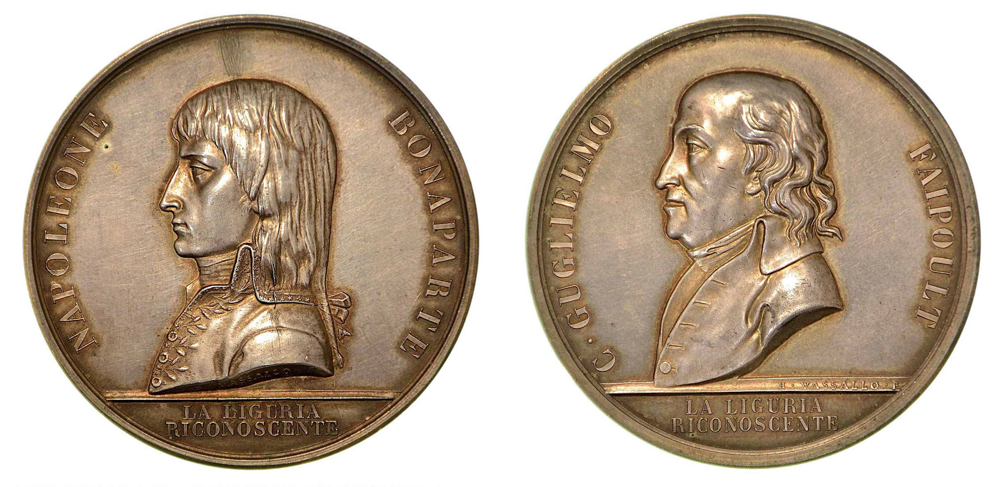 COSTITUZIONE DELLA REPUBBLICA LIGURE., Medaglia in argento, 1797. Busto a s. del generale Bonaparte in divisa e a capo scoperto. R/ Busto a s. del Faypoult in divisa e a capo scoperto. Opus di G. Vassallo. Julius 550. Essling 717. Adani, 14. Turr. 118. Bramb. p. 31. diam mm. 50,2. SPL/q.FDC