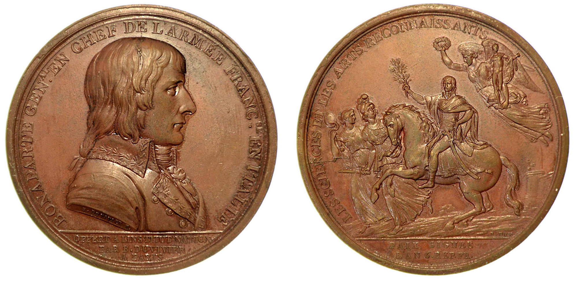 TRATTATO DI CAMPOFORMIO (17 ottobre 1797 – Fine della Repubblica di Venezia)., Medaglia in bronzo 1797. Busto di Napoleone in uniforme a d. con chioma fluente; sulla troncatura. R/ Il Generale Bonaparte a cavallo verso s., con ramo d'ulivo, preceduto da Bellona e Prudenza; la Vittoria in volo verso s., con la statua di Apollo Belvedere, lo incorona. Opus P. S. B. Duvivier. Julius 575. Essling 726. diam. mm. 56. q.FDC