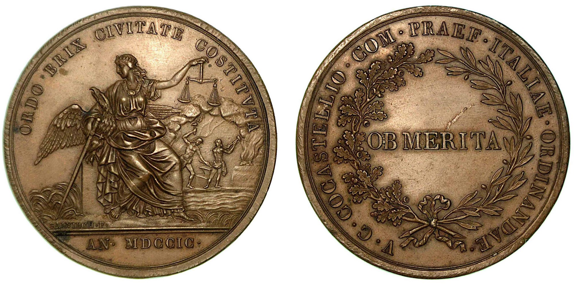 RISTABILIMENTO DELL’ORDINE A BRESCIA PER OPERA DEL PREFETTO COCASTELLI., Medaglia in bronzo 1799. La Giustizia imperiale, seduta frontalmente su un basamento, regge una bilancia, una spada ed un’aquila. Sul fondo a destra, due operai in riva ad un fiume battono il ferro su un’incudine davanti ad una caverna. R/ Leggenda OB MERITA entro corona di quercia ed alloro. Opus Joseph Salvirch. Turr. 156. Coll. Beraud 1931, n.1292. Vedi V. Pialorsi, estratto da “Medaglia” ed. S. Johnson, n. 26, p. 38. diam.mm. 52. SPL