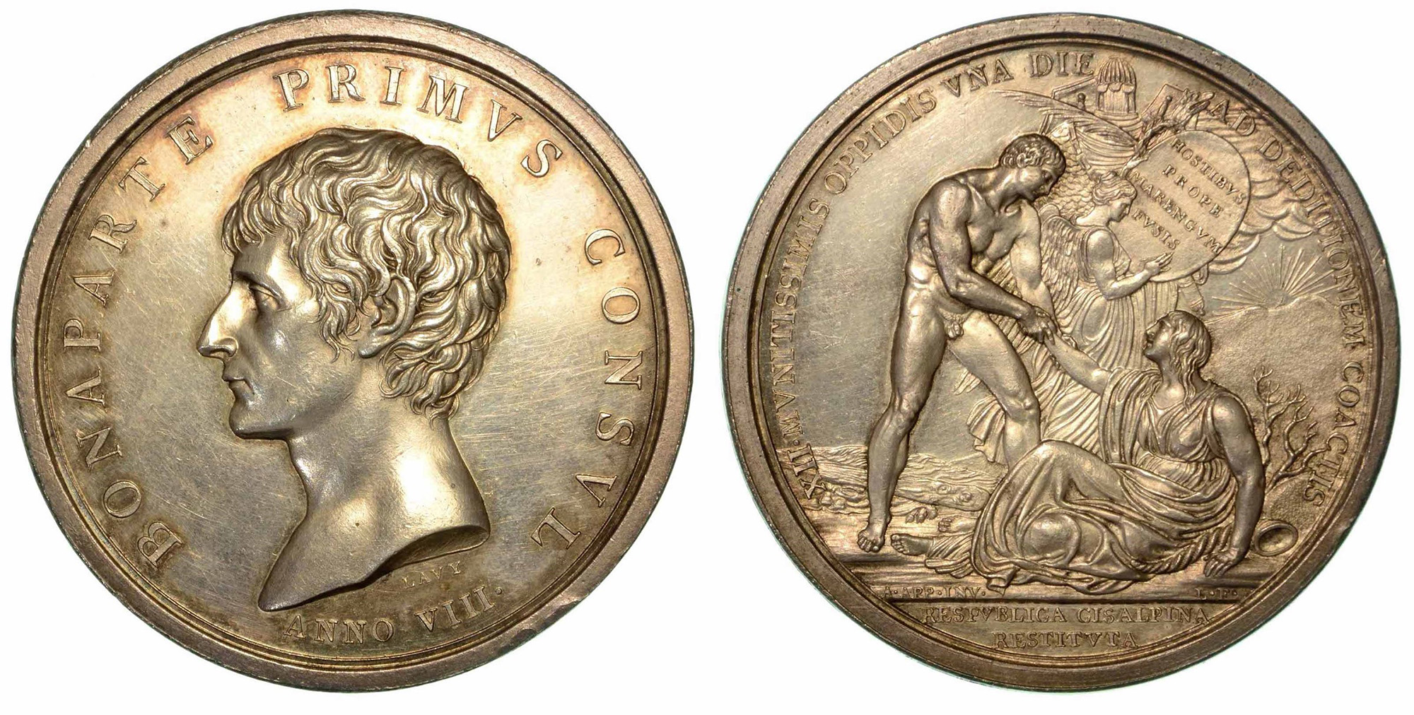CONVENZIONE D’ALESSANDRIA. RESTAURAZIONE DELLA REPUBBLICA CISALPINA., Medaglia in argento anno VIII (1800). Testa a s. di Bonaparte. R/ Ercole solleva la Repubblica Cisalpina e la Vittoria scrive su uno scudo leggenda in quattro righe. Opus Carlo Lavy (su disegni di Antonio Appiani). Bramsen 42. Julius 802. Essling 838. Adani, 20. Bramb. p. 40. Turricchia 194. diam. mm. 52,8. SPL/FDC