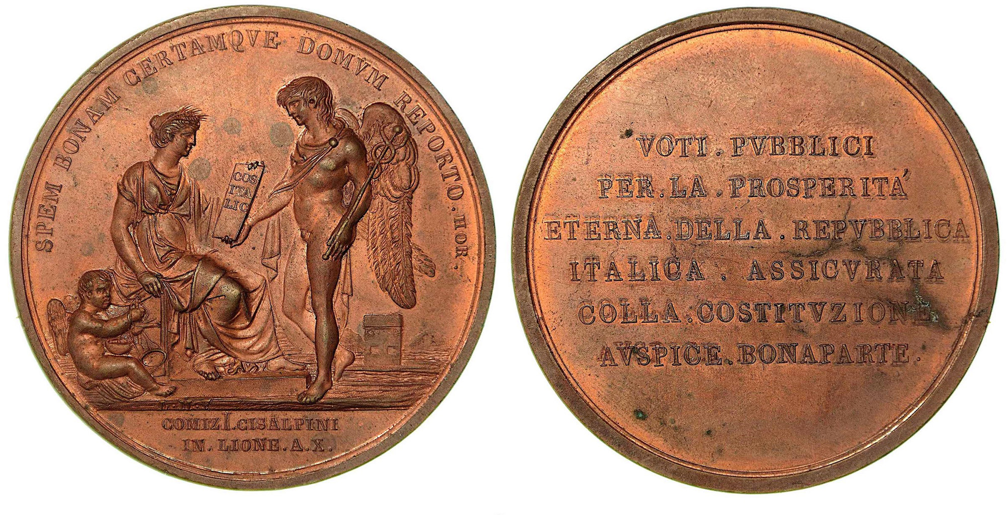 LA REPUBBLICA ITALICA PER IL COMIZIO DI LIONE., Medaglia in bronzo anno X. Il genio delle Arti presenta alla Repubblica Cisalpina, seduta ed affiancata da un amorino alato, una tavoletta sulla quale vi é inciso COS ITALIC. R/ Nel campo, in sei righe, VOTI PUBBLICI PER LA PROSPERITA’ ETERNA DELLA REPUBBLICA ITALICA ASSICURATA COLLA COSTITUZIONE AUSPICE BONAPARTE. Opera di Luigi Manfredini. Bramsen 190. Julius 1046. Adan, 23. Bramb. p. 54. diam. mm. 54,5. q.FDC