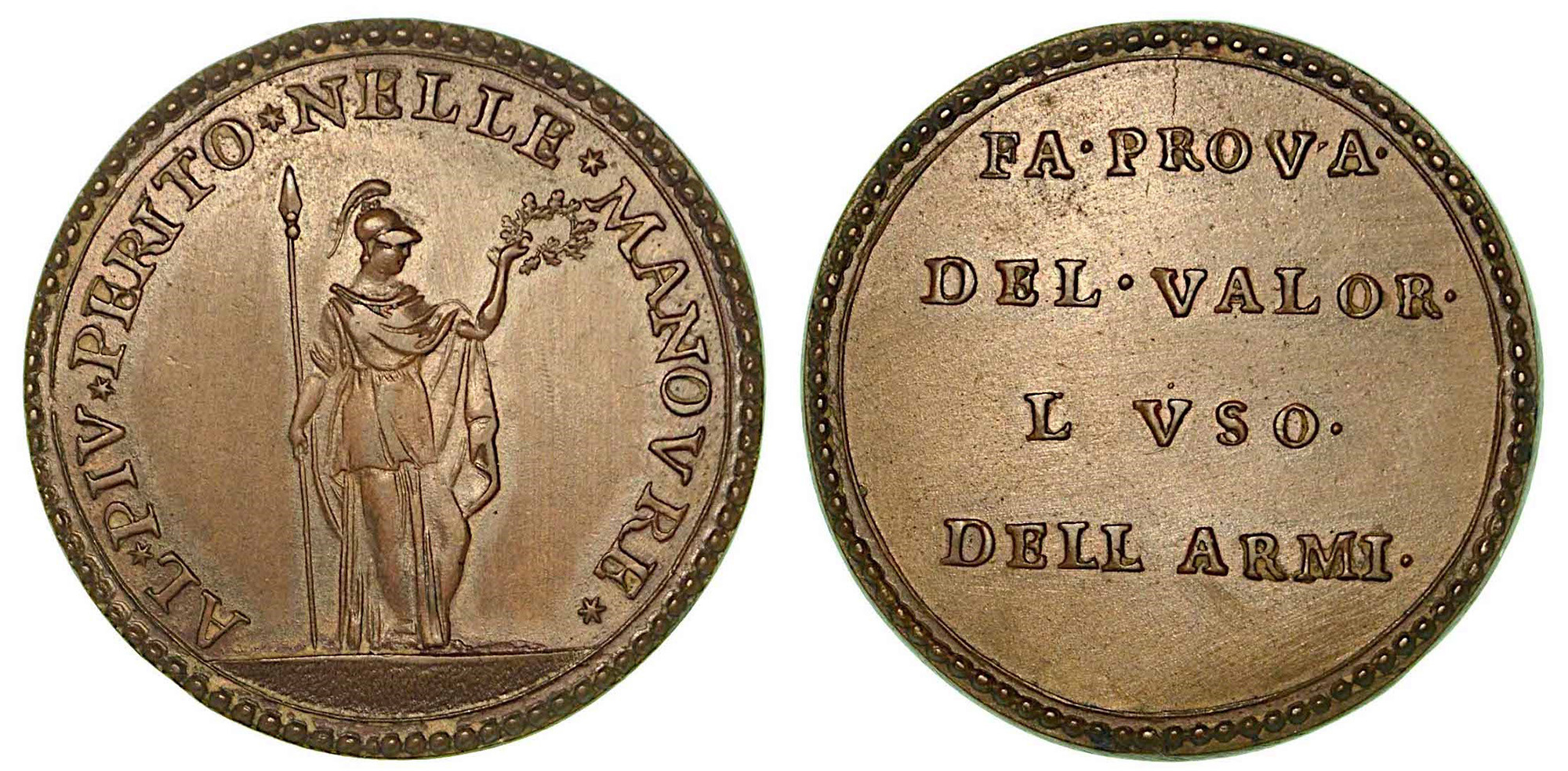 PREMIO DELLA REPUBBLICA CISALPINA., Medaglia in bronzo s.d. Figura galeata in piedi volta a d., tiene corona e luna asta. R/ Legenda FA PROVA DEL VALOR L VSO DELL'ARMI in quattro righe. Beraud 1364. diam mm. 35,9. SPL