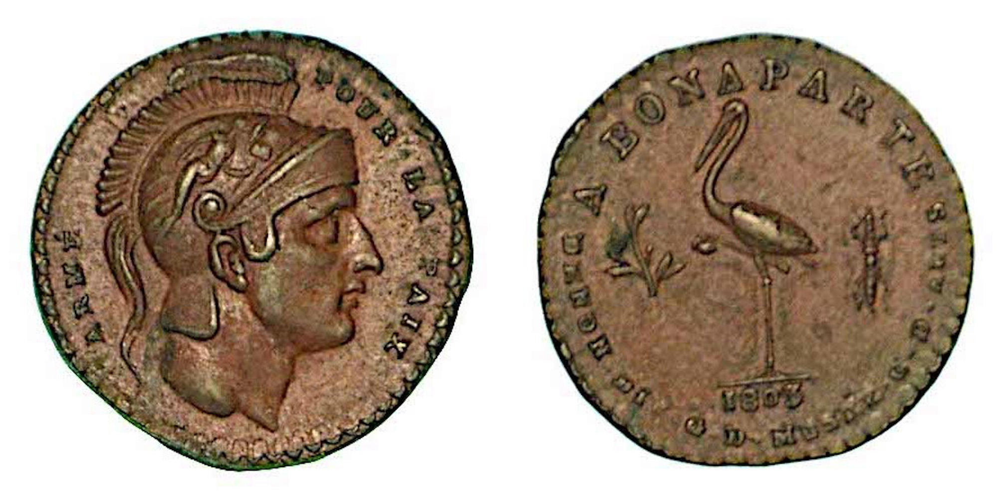 NEGOZIATI DI PACE CON L'INGHILTERRA., Medaglia in bronzo 1803. ARMÉ POUR LA PAIX Testa con elmo attico di Napoleone I a d. R/ A BONAPARTE nel campo un fenicottero stante a s., alla base 1803, ai lati ramo d'ulivo e fulmini, sotto leggenda circolare DENON• DIR• G• D• MUSÉE• C• D• ARTS• Opus Denon. Bramsen 267. Julius 1160. Essling 933. Bourgerot 371. TNR 95.7. diam. 13,2 mm. SPL