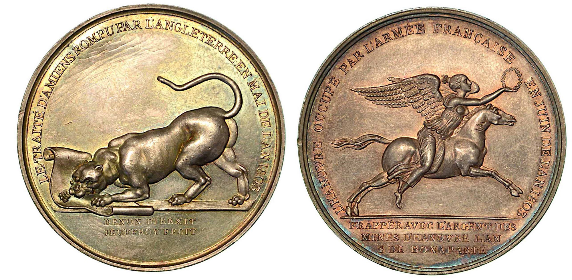 ROTTURA DEL TRATTATO D'AMIENS - OCCUPAZIONE DI HANNOVER., Medaglia in argento 1803. Leopardo inglese addenta il Trattato. R/ Vittoria alata, con corona d'alloro, a cavallo verso a destra. Opus Jeuffroy. Julius 1165. Essl 995. Bramsen 271. diam. 41. SPL/q.FDC