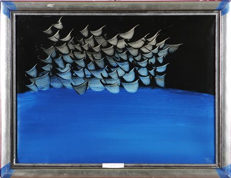 CAZZOLA CLAUDIO (n. 1940) Immagine sospesa. 1973. Acrilico su tela. Cm 80,00 x 60,00. Sigla in basso a destra. Al retro firma titolo e anno. Cornice presente