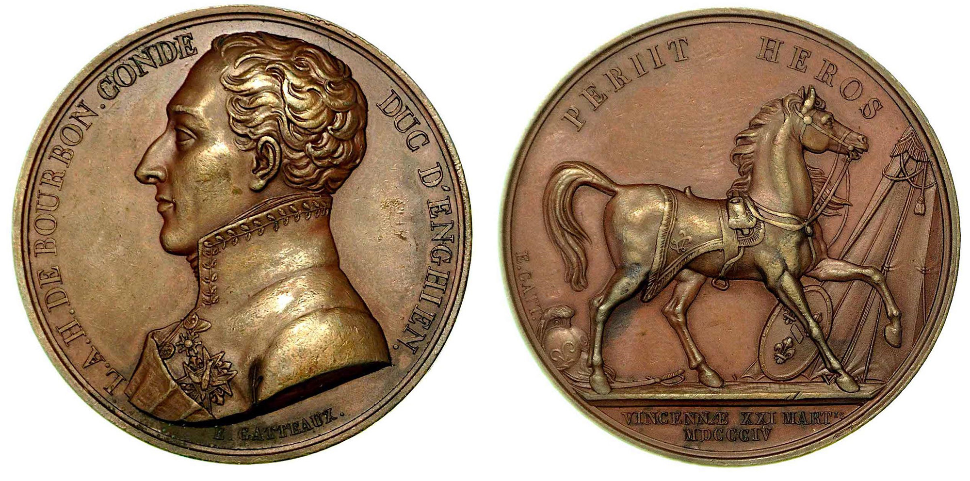 FUCILAZIONE DEL DUCA DI ENGHIEN., Medaglia di bronzo 1804. Busto del Duca a s. R/ Cavallo davanti ad una tenda. Opus Gatteaux. Bramsen 294. Julius 1210. Essling 1007. diam. mm. 41. SPL