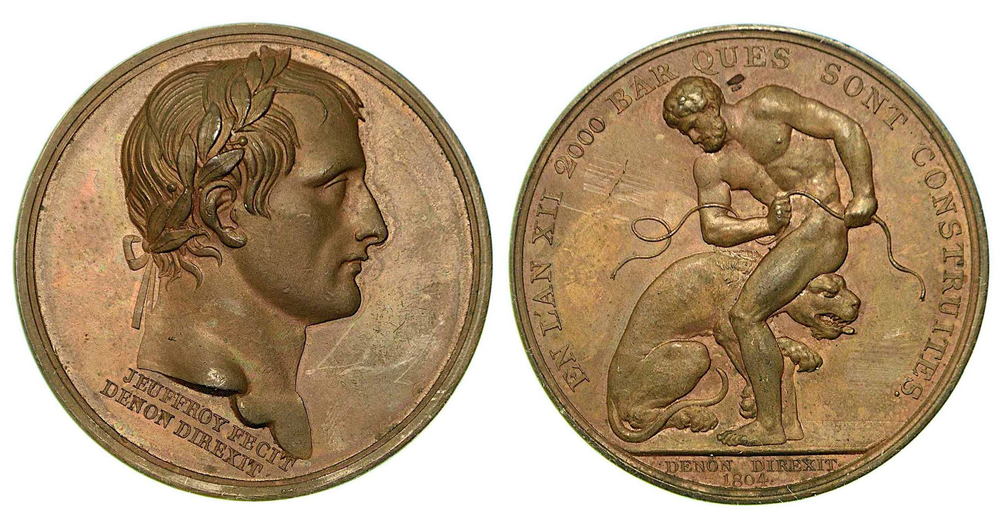 CAMP DE BOULOGNE, PREPARATIVI D'INVASIONE DELL'INGHILTERRA., Medaglia in bronzo anno XII (1804). Testa laureata a d. R/ Ercole con una lunga corda trattiene tra le gambe un leopardo. Opus Jeuffroy. Bramsen cfr 320. Julius 1254. Essling 1019. diam. mm. 40,6. SPL/FDC