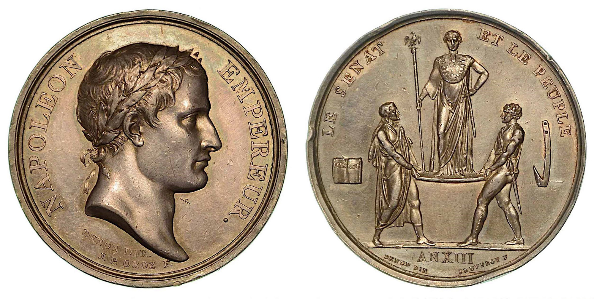 INCORONAZIONE DI NAPOLEONE A PARIGI., Medaglia in argento 1804. Testa laureata a d. R/ Napoleone su scudo sostenuto da due soldati, ai lati libro aperto e aratro; in esergo, AN XIII. Opus Denon - Gallet. Bramsen 326. Julius 1258. Essling 1020. diam. 40,3. SPL