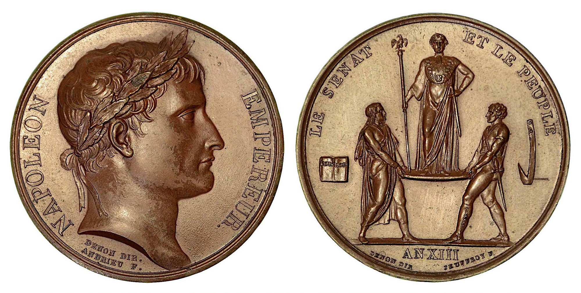 INCORONAZIONE DI NAPOLEONE A PARIGI., Medaglia in bronzo anno XIII (1804). Busto laureato a d. R/ Due uomini, un magistrato rappresentante il Senato e un soldato rappresentante il Popolo, sorreggono uno scudo sul quale è ritto l’imperatore con un’asta di comando in mano. Dietro il Senato, un libro; dietro il Popolo, un aratro. Julius, 1260. Essling, 1021. Bramsen, 326. diam. mm. 40. SPL
