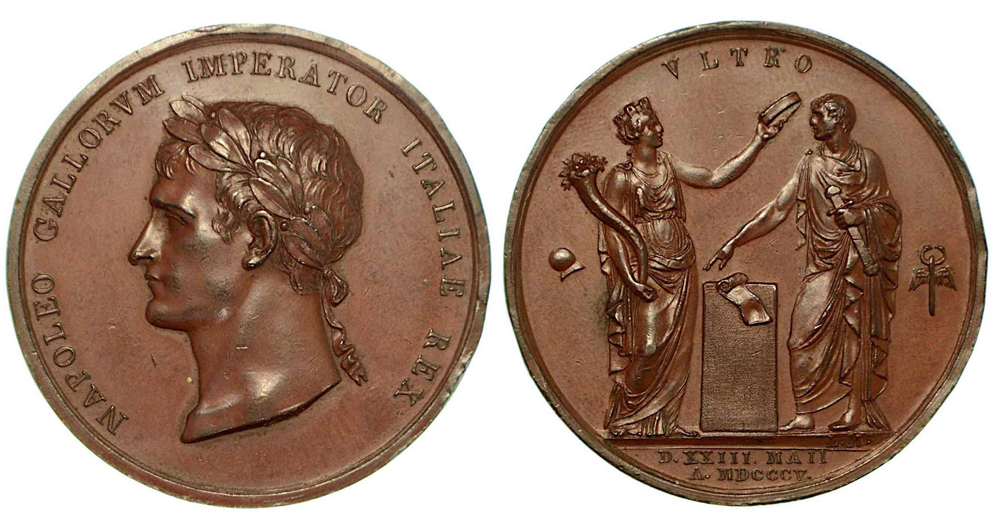 INCORONAZIONE A MILANO DI NAPOLEONE A RE D’ITALIA., Medaglia in bronzo 1805. Testa laureata a s. di Napoleone a capo scoperto. R/ Nel campo, l’Italia con cornucopia pone la corona ferrea sul capo di Napoleone col manto regale: a s. dell’Italia un elmo; a d. di Napoleone un caduceo e al centro un altare. Opus L. Manfredini. Bramsen 420. Turricchia 429. diam. mm. 42. BB/q.SPL