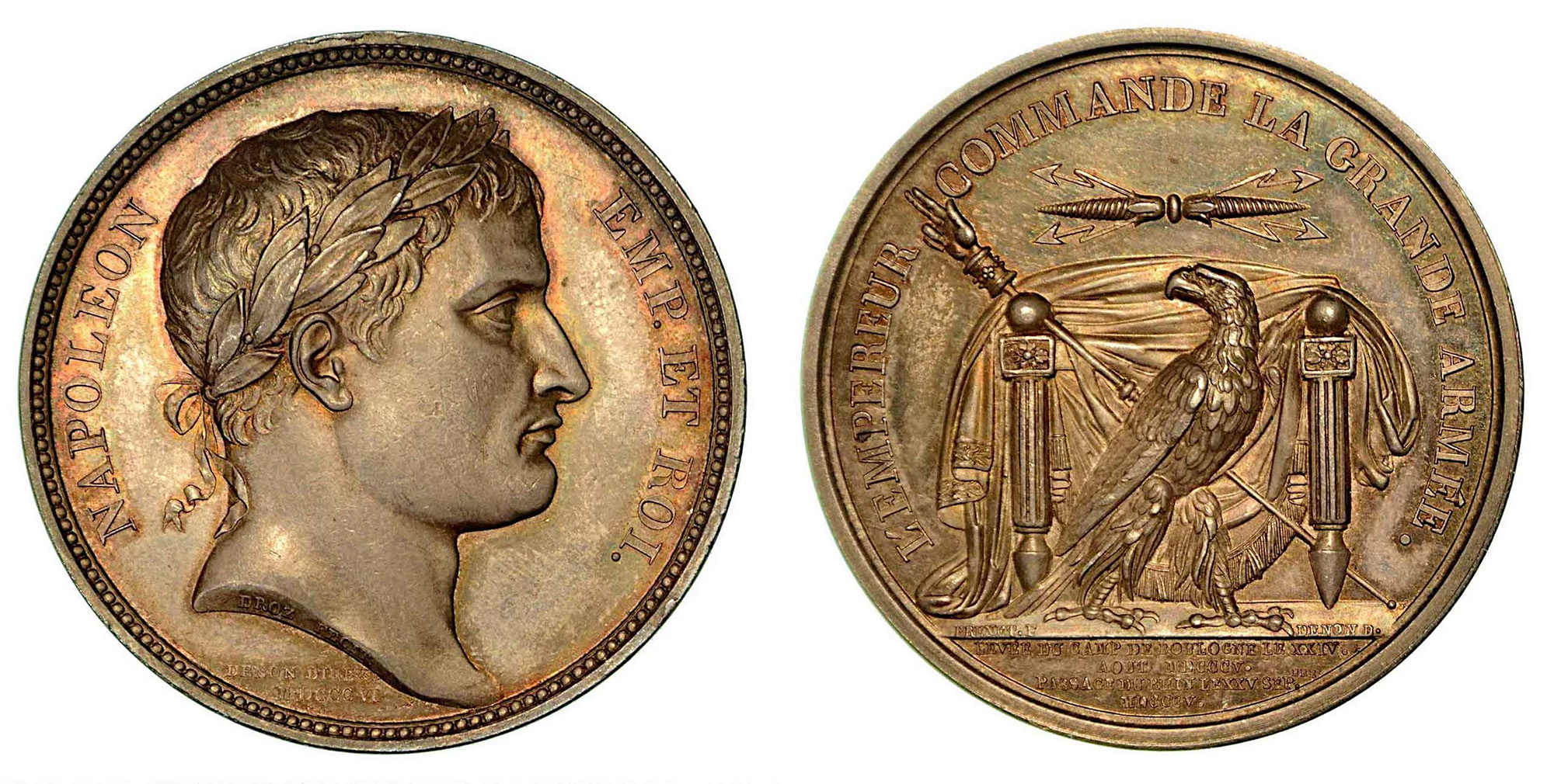 PASSAGGIO DEL RENO E DEL DANUBIO., Medaglia in argento 1805, Parigi. Testa laureata a d. dell'Imperatore. R/ Trono con scettro e aquila raccolta a d., in alto, fulmini. Opus Droz & Brenet. Bramsen cfr. 430. Julius 1408. Essling 1081. diam. mm. 40,5. SPL/FDC